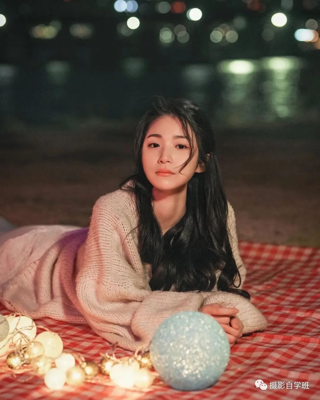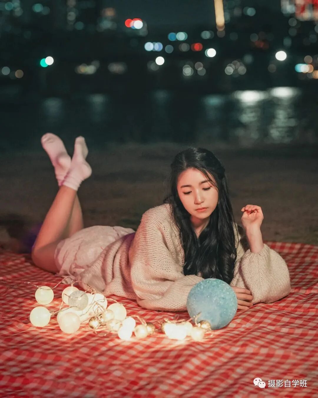 趴着的时候,手可以放在哪里呢?可以像上图一样,两个手放在胸前,把身体支撑起来,拍照之后,会更加立体,不塌陷。因为夜里拍摄照片,人的面部,看起来会比较暗,如果在地毯上,准备一些小灯,起到装饰作用的同时,还能给人的面部进行曝光,让人的脸,看起来更亮一点。拍摄全身,像下图这样,比上图那样拍摄半身,看起来会更加优美。