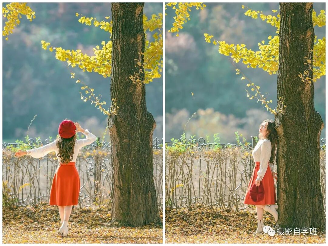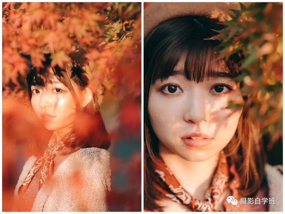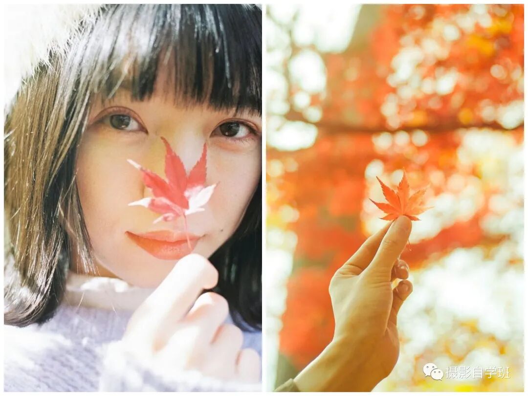 如果你没有姿势可摆,最好用的方法,就是使用道具,身边的一些东西都可以作为道具,比如像上图这样使用枫叶。可以向上图左侧这样,用枫叶遮住鼻子,或者像上图右侧这样,拍摄一些人拿枫叶的细节姿势,照片就会显得很文艺。