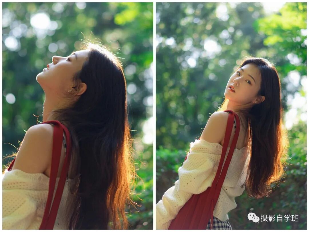 站着的姿势可以怎么摆呢?可以像上图这样向后倾斜身体,闭眼或者看向天空,向上图左成这样,另外一张回头看向镜头。这张照片之所以好看,除了摆姿势以外,更重要的是逆光拍摄,可以让人的头发上有轮廓光。