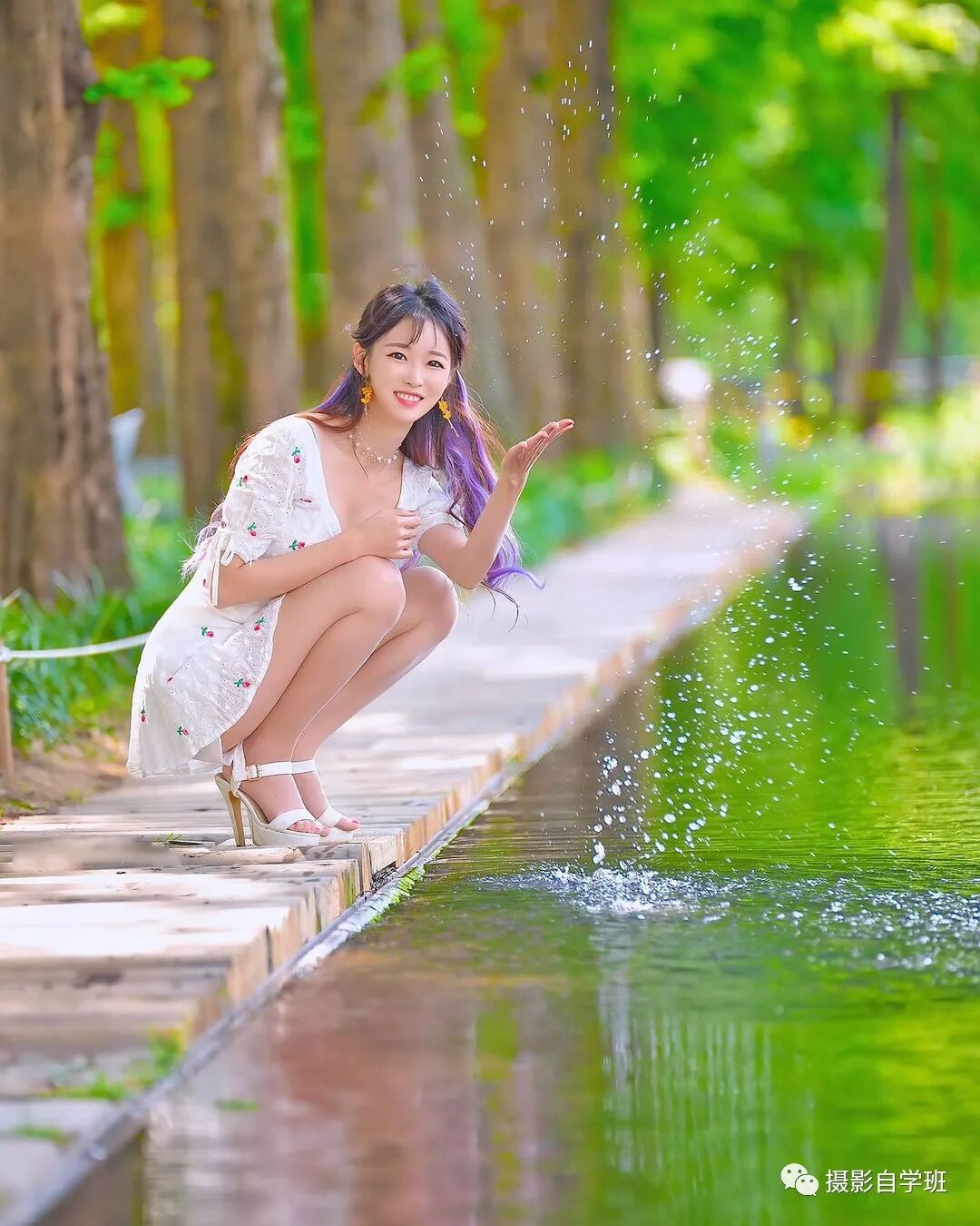 如果想让照片更加有立体感,可以选择站在楼梯上拍照。将一个腿放到楼梯上,让另一个腿微微弯曲,身体的重心放在另一个腿上,这样能够拉长腿部线条,同时利用楼梯的高低差,让照片更加有层次感。在室外拍,可以寻找图7这样的路边、河边,顺着路或者岸边向前拍,照片的纵深感就有了,再蹲下拍摄到水面倒影,照片的立体感就有了。