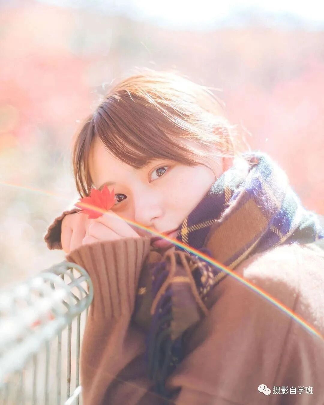 这个技巧,很多朋友都已经知道了,解决摆姿,手拿道具,是最好的办法,但不要犯图4这样的错误,道具是为了增加照片美感的,而一个矿泉水瓶子,放在脸旁并,不能够起到增加美感的作用,可以像图5这样,捡一片好看的枫叶,既安排了手部姿势,还能够起到很好的点缀作用。