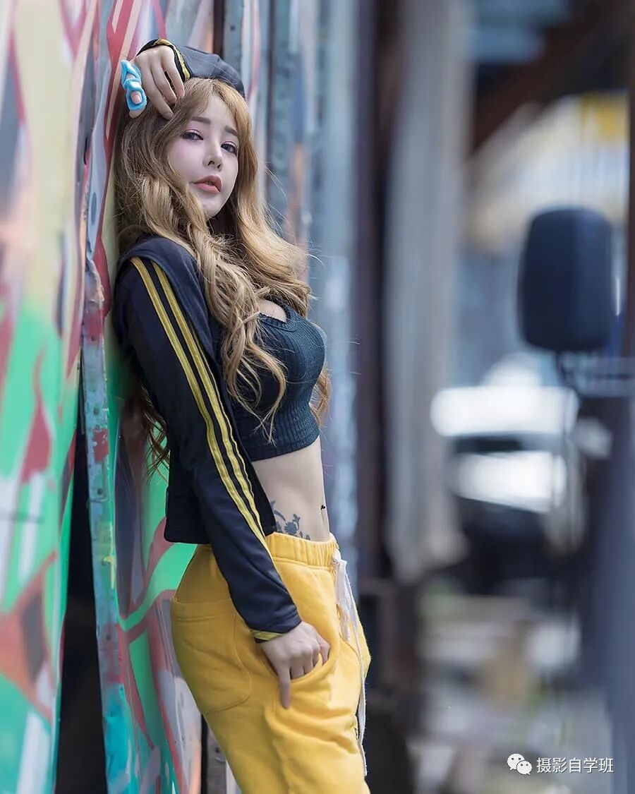 摄影技巧,就要随时随地都可用,在生活中,很容易遇到图2与图3这样的墙,当你没姿势可摆,手部不知道放在哪里好时,可以像图2与图3这样,让被拍摄的人,靠在墙上,摄影师要注意,相机也要贴在墙上,这样顺着墙向前拍,对焦在人物的眼睛上,人的眼睛,会清晰,而离镜头近的墙,才会被拍成图2与图3这样的虚化。手部姿势就很好解决了,可以像图2这样,拿着一杯酸奶,另外一只手自然下垂,还可以像图3这样,一只手插兜,一只手放到头顶。