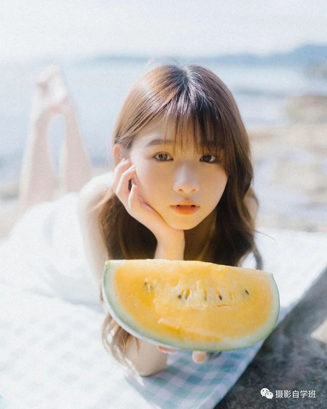 怼脸拍摄,是不太建议的,太狠了,会把照片拍成大头贴,像图8这样就有一些愣愣的。而可以在地上铺一块布,让被拍摄的人,趴在布上,用手托着下巴,但尽量不要把下巴挤压变形,同时手中拿着一些水果,伸向镜头,与镜头,有一个互动姿势,表情就会更加自然得体。