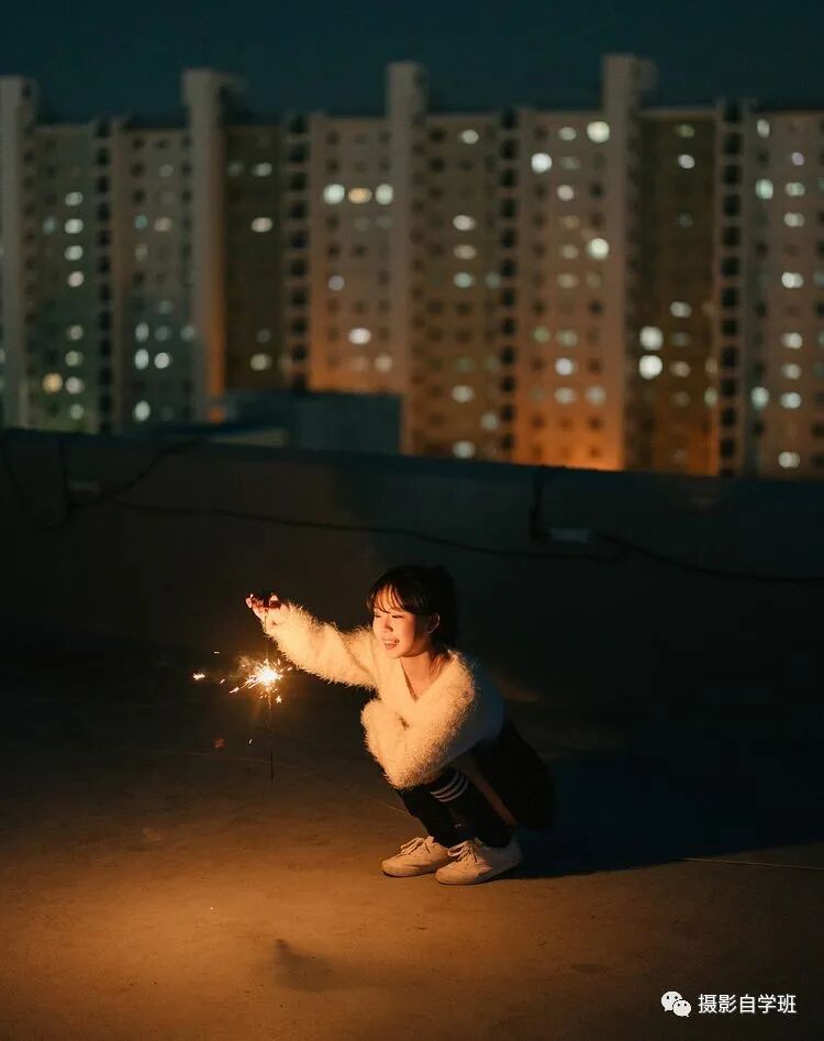 夜里拍照片,如果没有电的补光设备,那就像图4、图5、图6、图7这样,准备一些小的烟花吧,拍摄的时候,点燃烟花,烟花除了起到点缀的作用,更主要的是,这些烟花会给人的面部补光,但不建议像图4那样,蹲在那里拍照,虽然能够拍到背景的楼群,形成的光斑,但人物的姿势,还是不太雅观。