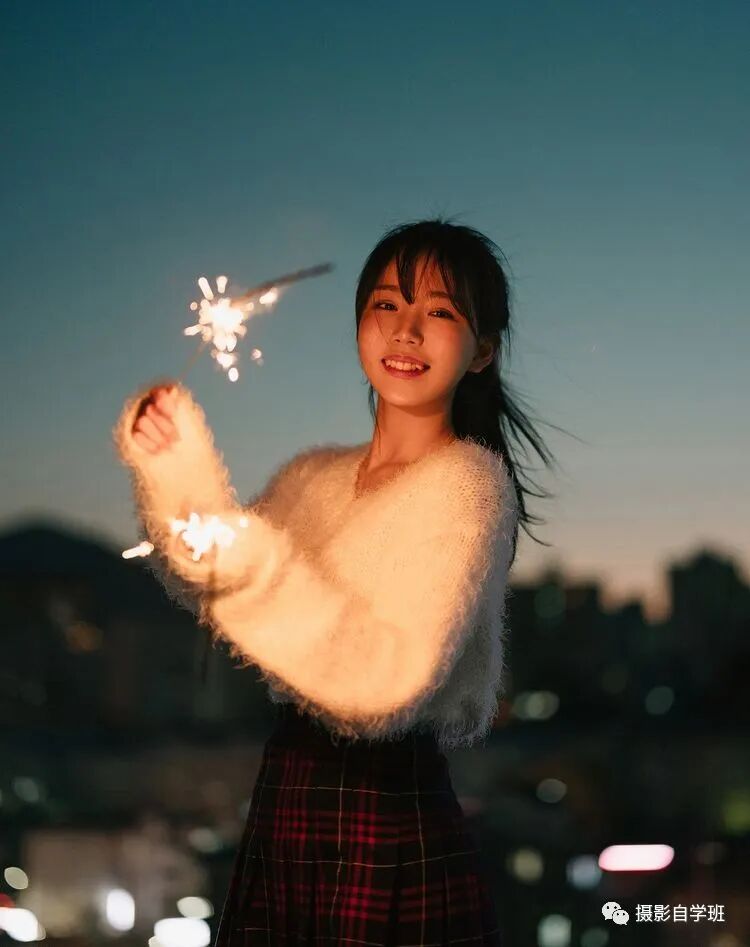 可以像图5这样,站起来,把烟花伸向镜头,这样烟花就能被拍得虚化,人的脸,被拍得更加清晰,画面更有层次感,还可以像图6这样,眼神迷离一点,一张人像照片,会因为一个人的眼神,而充满故事感,图7这样的微笑,也很不错。