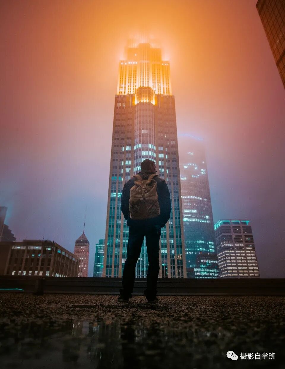 而我们还可以来到一些楼顶,在确保安全的情况下,用一些楼顶灯光有特点的建筑做背景,人物居中,背影照片也可以很美。