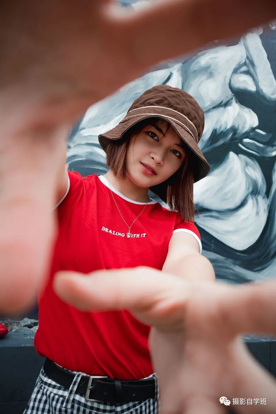 你可以让模特的手,形成下图的手势,你蹲下来,让模特的手伸向镜头,让模特看镜头,不用有特别的表情,专注即可。这样既引导了观者的视线,又形成了很好的“框”,让照片更具体。