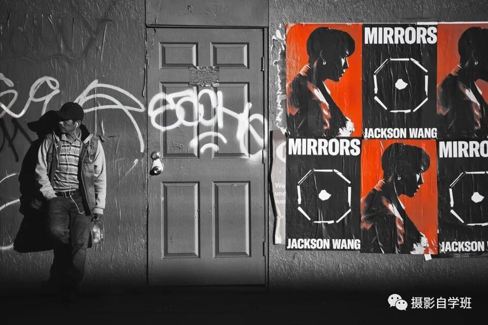 还比如利用墙上的贴画,人脸的朝向,与贴画相反,可以形成很好的对比,增加照片的趣味。