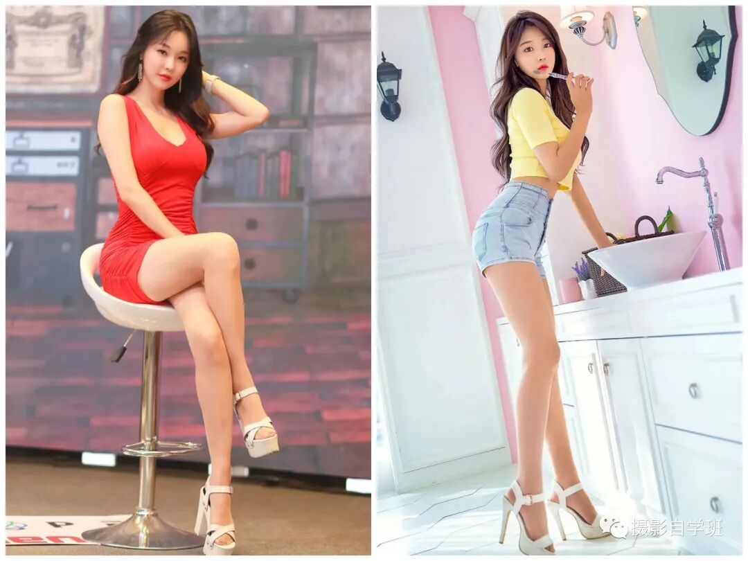 如果是在室内拍摄,想让站着的照片,更显高更显瘦,那摄影师就要像图10这样,蹲下来,从下向上仰拍,这种角度,可以让被拍摄的人,显得更加挺拔。被拍的人,穿着一些高跟鞋,拍摄的时候,把离镜头近的这个脚面绷直,可以更显腿长,室内拍摄,也要注意自己的妆容,点上红唇,可以让脸部更加优美。