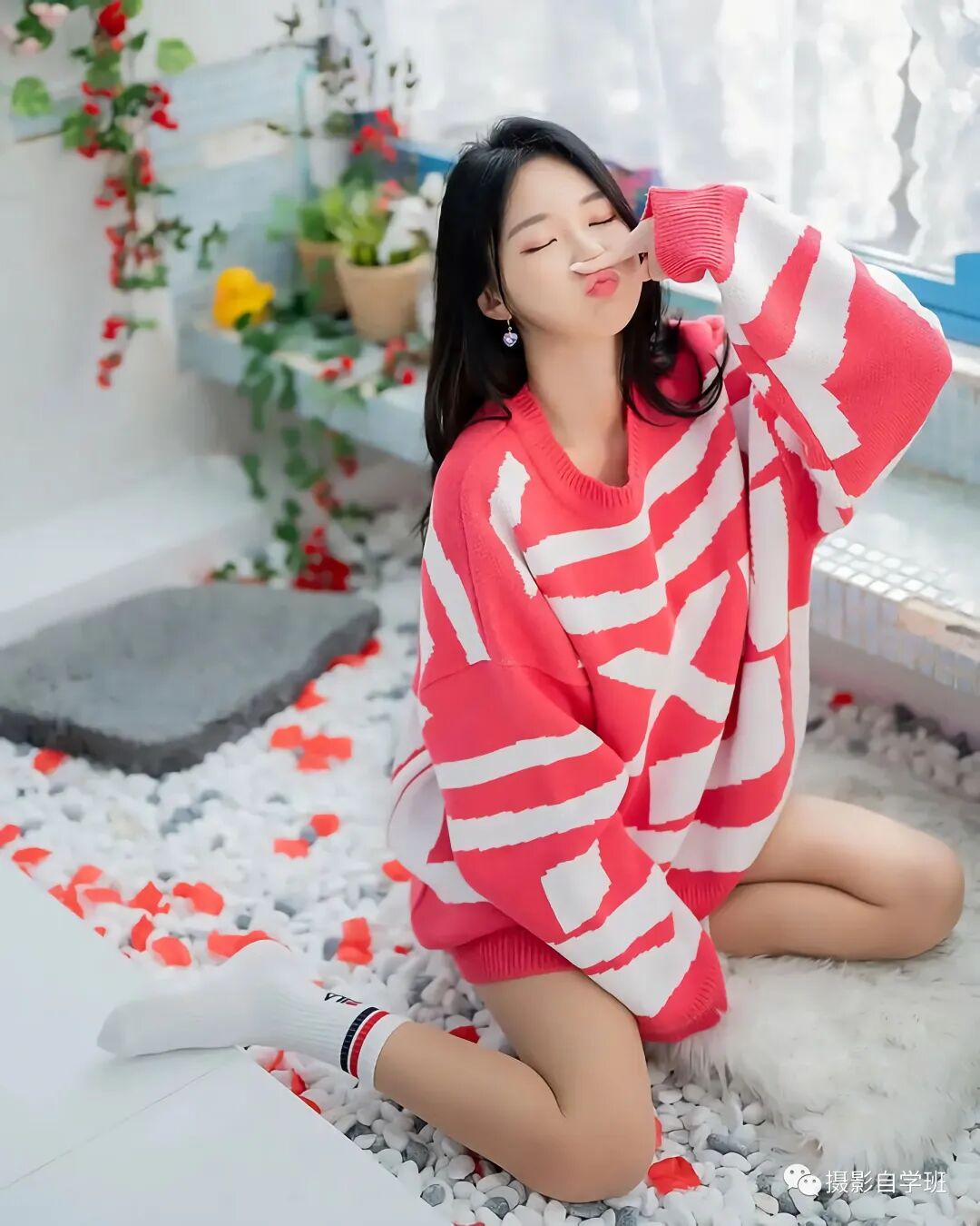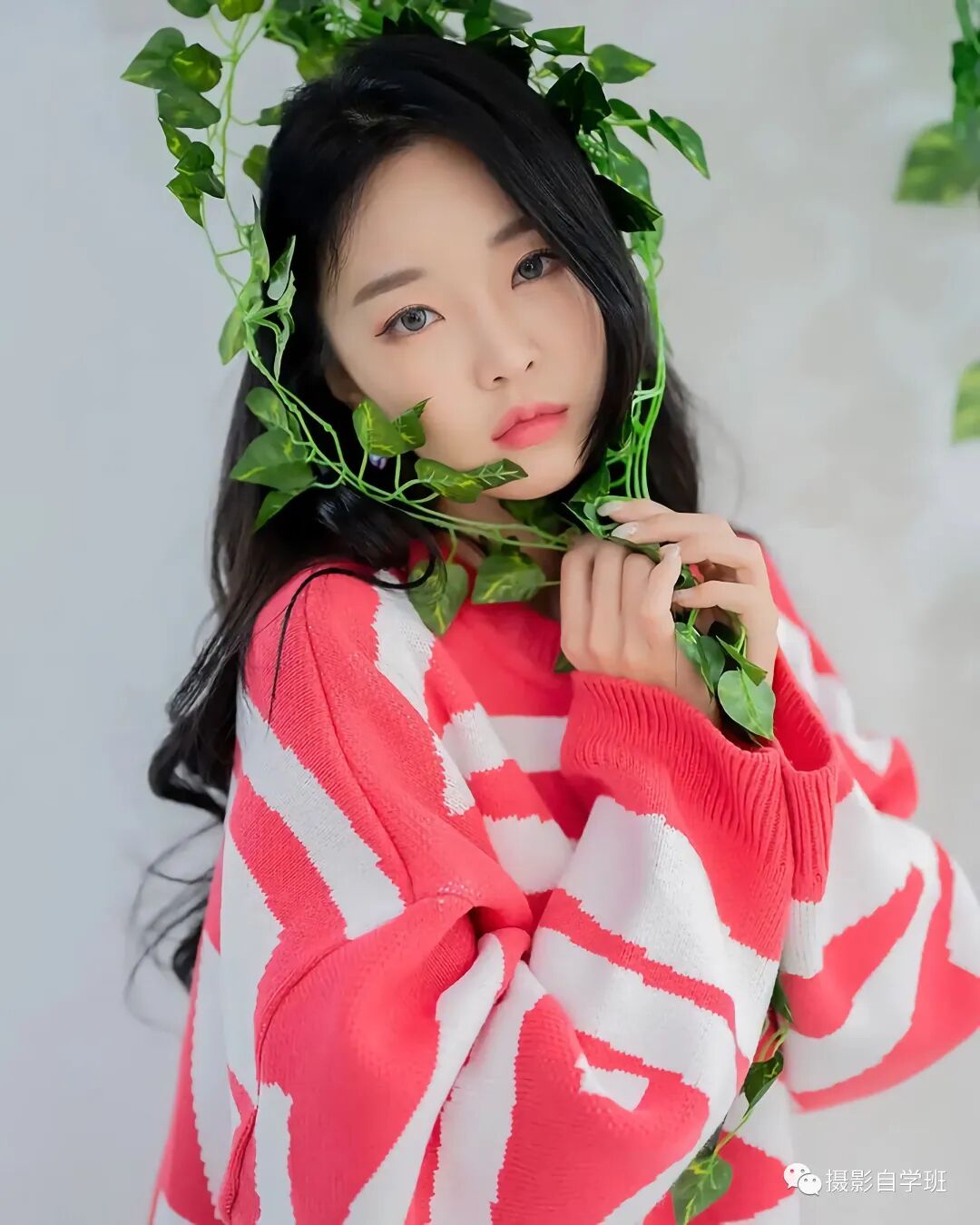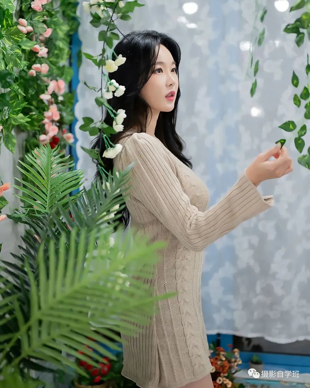图4图5图6这三张照片,都是在室内拍摄的,用了一些装饰,这里是为了告诉大家,使用装饰的时候,不要用错像图4这张照片一样,之前的教程上,已经提到过一次,把绿色的植物,围在脑袋上,不好看,也不优雅,倒不如直接像图5这样坐在那里,用手轻轻的抚摸自己的头发,歪头看着镜头,就行了,在室内拍照片,也不要全都拍半身照,可以像图6这样,拍一些全身照片。