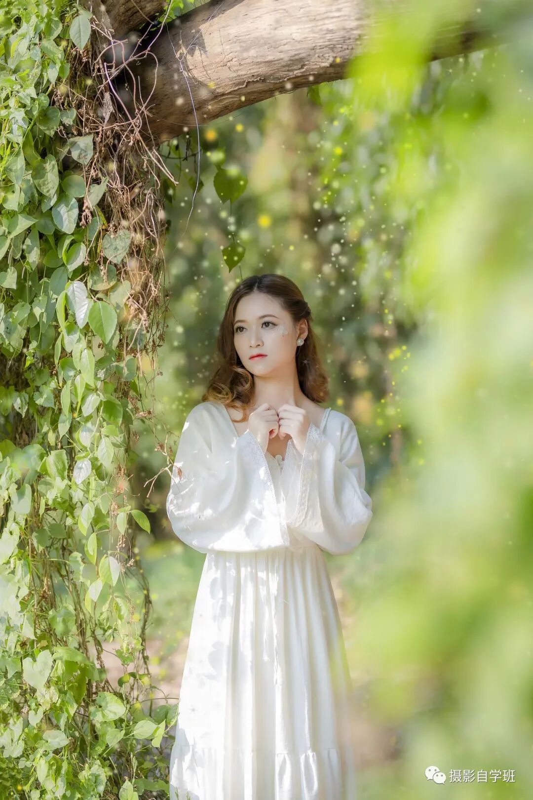人的脸上没有光,人坐在了影子当中,如果想让照片更好看,一定不要放过光影,要模仿图12这样,找一个有光的地方,人的脸在有光处,脸不暗,是一张人像照片合格的基础。并且拍图10这样的前景时,要保证拍摄范围之内,有光,前景的叶片才是明亮,绿色的,否则就会是黑乎乎的一片。