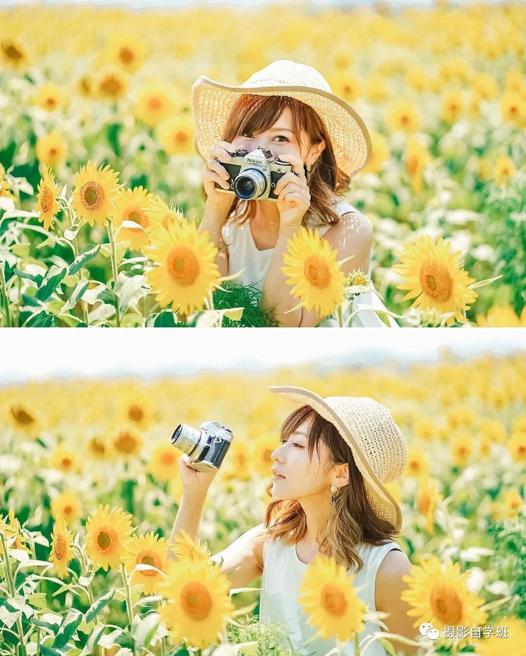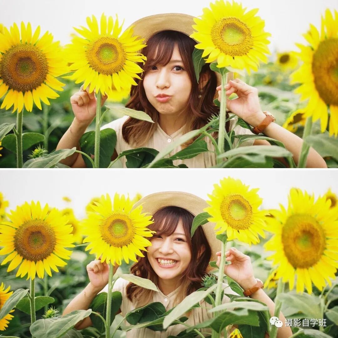你说我面对镜头的时候,笑不出来,那怎么能够让表情,面带笑容呢,可以像图2这样,对镜头做一些互动,两个手扶住向日葵,冲着镜头嘟嘴,或者与镜头藏猫猫,就可以让脸上,带有笑容了。