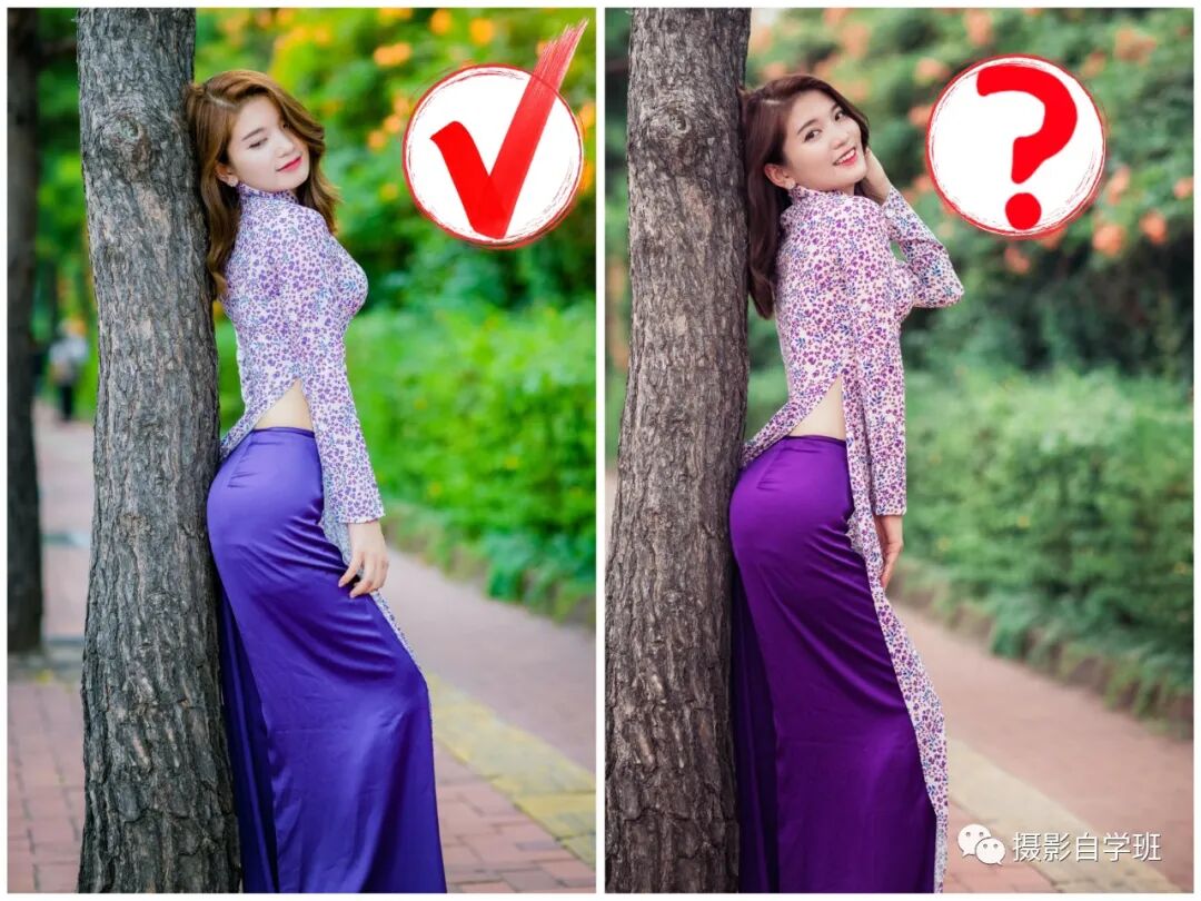 怎么能够让自己的姿势,看起来妖娆一点,优美一点,那就可以像图1这样,依靠在一棵大树上,提臀扭胯,回眸微笑。整体动作,一气呵成,优美的身姿,就展示出来了,完美解决摆姿问题,面部表情也更漂亮。