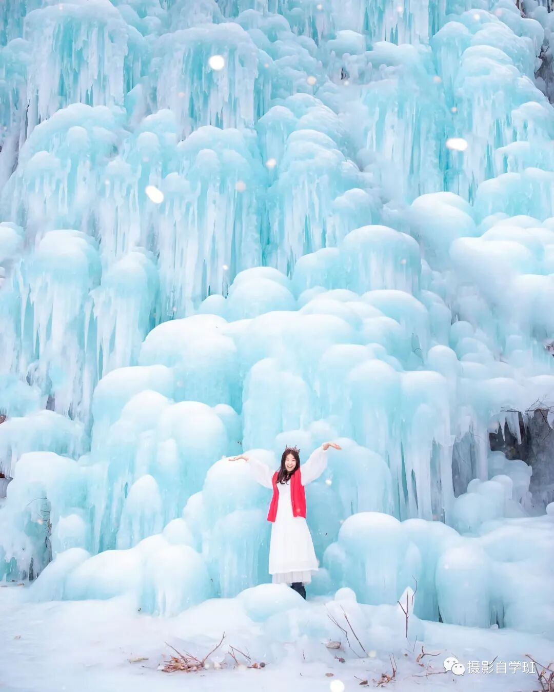 冬天的人像照片,很好拍摄,记住“用特殊颜色的点”,像图11和图12,都是这样的例子。图11的静物,颜色区别于冰瀑,图12红色围巾,颜色区别于冰瀑,这样特殊的颜色,都可以让主体更突出,同时利用对比,都能让照片更有张力。