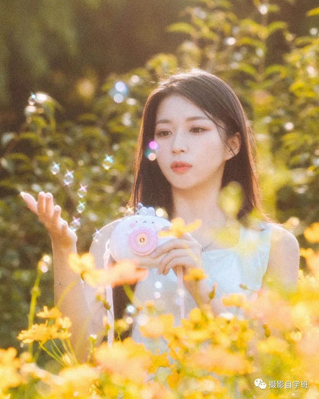 拍摄人像照片,怎么拍出自然的表情,自然的姿势呢?对于新手朋友来说,最简单的方法,就是使用道具。像图13这样,准备个泡泡枪,拍摄的时候喷射泡泡,让被拍的人,和泡泡互动,当她不关注镜头时,表情和动作,就会更自然了。新手朋友可以用道具,多多练习人像拍摄。