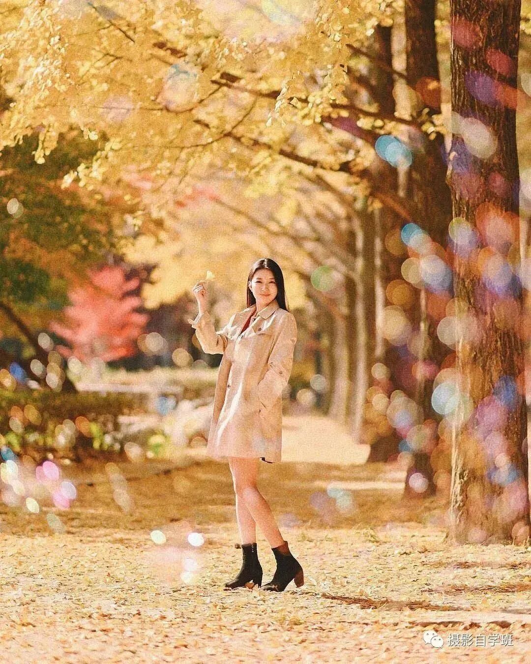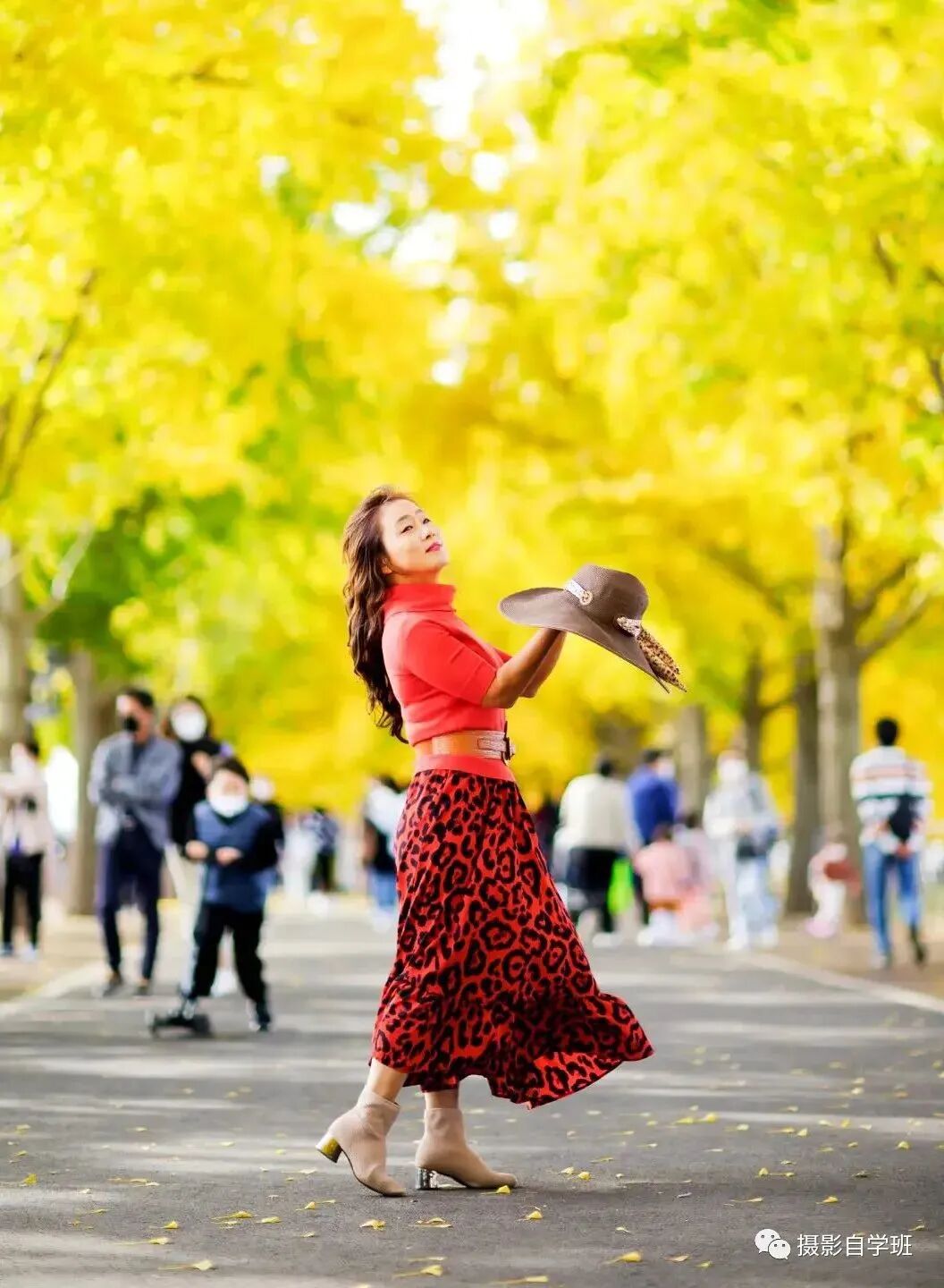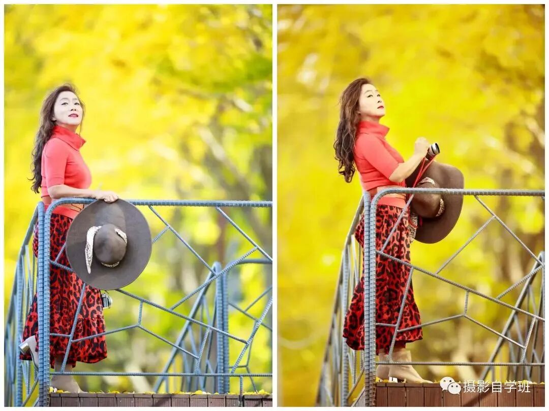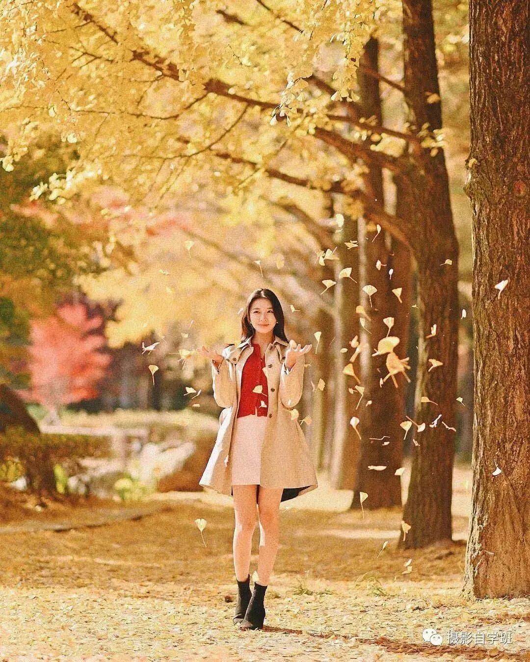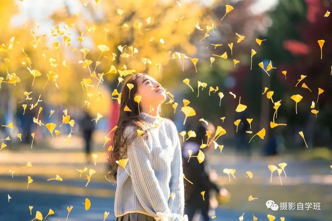 实在没有姿势可摆了,该怎么办呢?最好用的方法,就是带些道具,或者利用现场的景物,比如图10,利用现场的树叶,把落叶扬起来,摄影师在拍摄之前,设置成连拍模式,并且把光圈调大,把快门调快,按住快门不撒手,就能一下子,连拍很多张,从多张照片当中,就能挑选一张人物的姿势比较好,落叶也正在空中飘洒的照片了,图12是同样的道理。