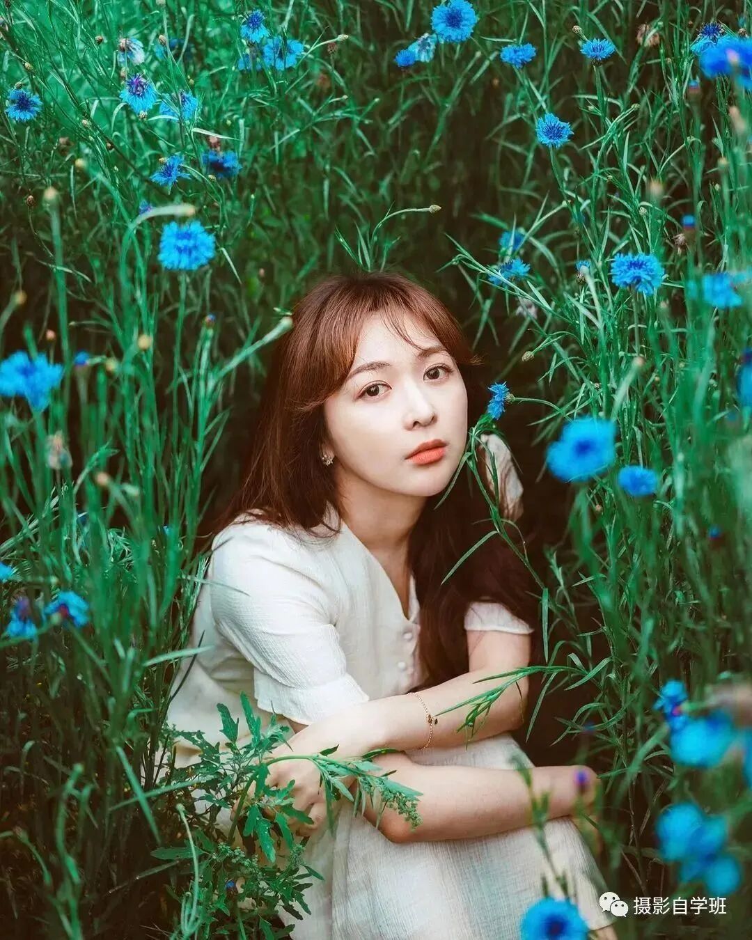 还可以让被拍摄的人,像图6这样,蹲在或者坐在花丛中,从上向下俯拍,因为周围全都是花草,所以人并不会被拍得很矬,而又正因为周围都是花草,背景看起来,相对很洁净,照片会更加干净漂亮。