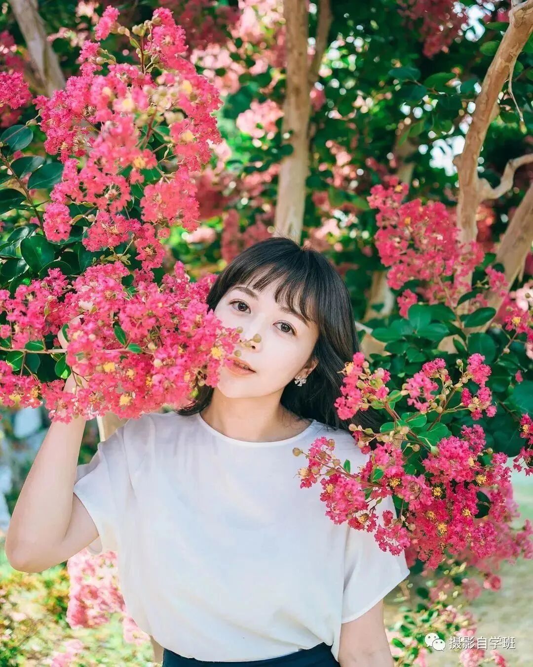 如果遮脸的话,可以让花虚化一点,离镜头近一点,离人的脸远一点。如果想让花起到一个简单的装饰作用,或者让周围的植物,起到一个点缀的作用,那就可以像图5这样,随便摸着旁边的一根枝条,这样手有处安放了,姿势就会更加协调自然了。