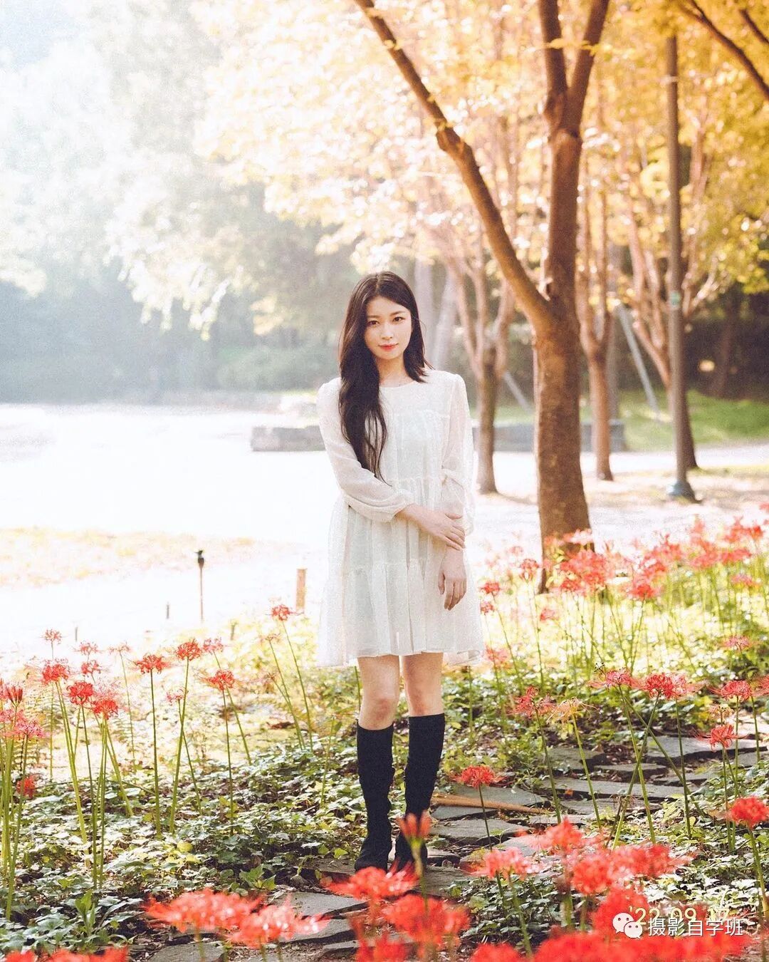 另外还可以像图9这样,摄影师拿着相机,或者手机,蹲在路边的草丛中,让被拍摄的人,位于大树下草丛上,此时遮挡镜头的草丛,就能被拍成虚化的前景,对焦在人的眼睛,把人拍清晰,人的小,与旁边树的大,还能形成大与小的对比,照片会更有张力,而且人物的衣服颜色,与现场环境搭配得也很好,树是粉色的花、人物穿着一个接近粉色的裙子,天是蓝色的,人物穿着一个接近蓝色的衣服,整体颜色比较鲜艳柔嫩,看起来更有青春的气息。