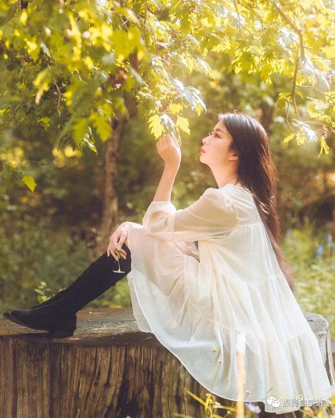 还可以像图6这样,用一些树叶进行遮挡,不把惨白的天空露出来人物,坐在一些现场的景物上,手中拿着身边的花、草、树叶作为点缀,摆姿就会更加自然,背景也会更加漂亮。
