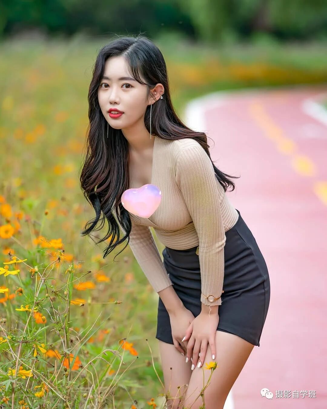 想要让姿势大方好看,那就让被拍摄的人,和身边的景物,做一些互动吧,可以像图10这样,伏在路边的花草前,做出闻花的姿势,同时不要把路完全挡上,这样背景当中,就能够带上路,人物的姿势,自然大方,背景又有纵深感,照片就会更好看了。