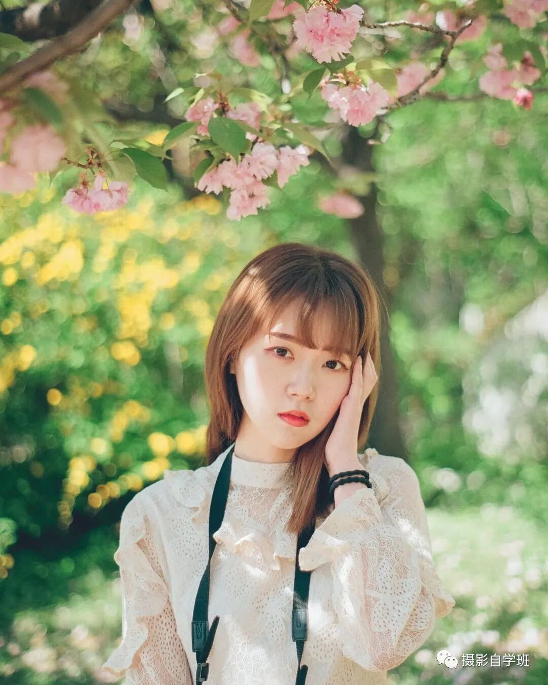 当背景有树时,注意错位关系,你看图6,背景的树虽然已经虚化,但因为错位,好似树干正好长在人的头顶一样,这是人像摄影的忌讳。而像图7这样,简单调整一个方向,就可以避开了。