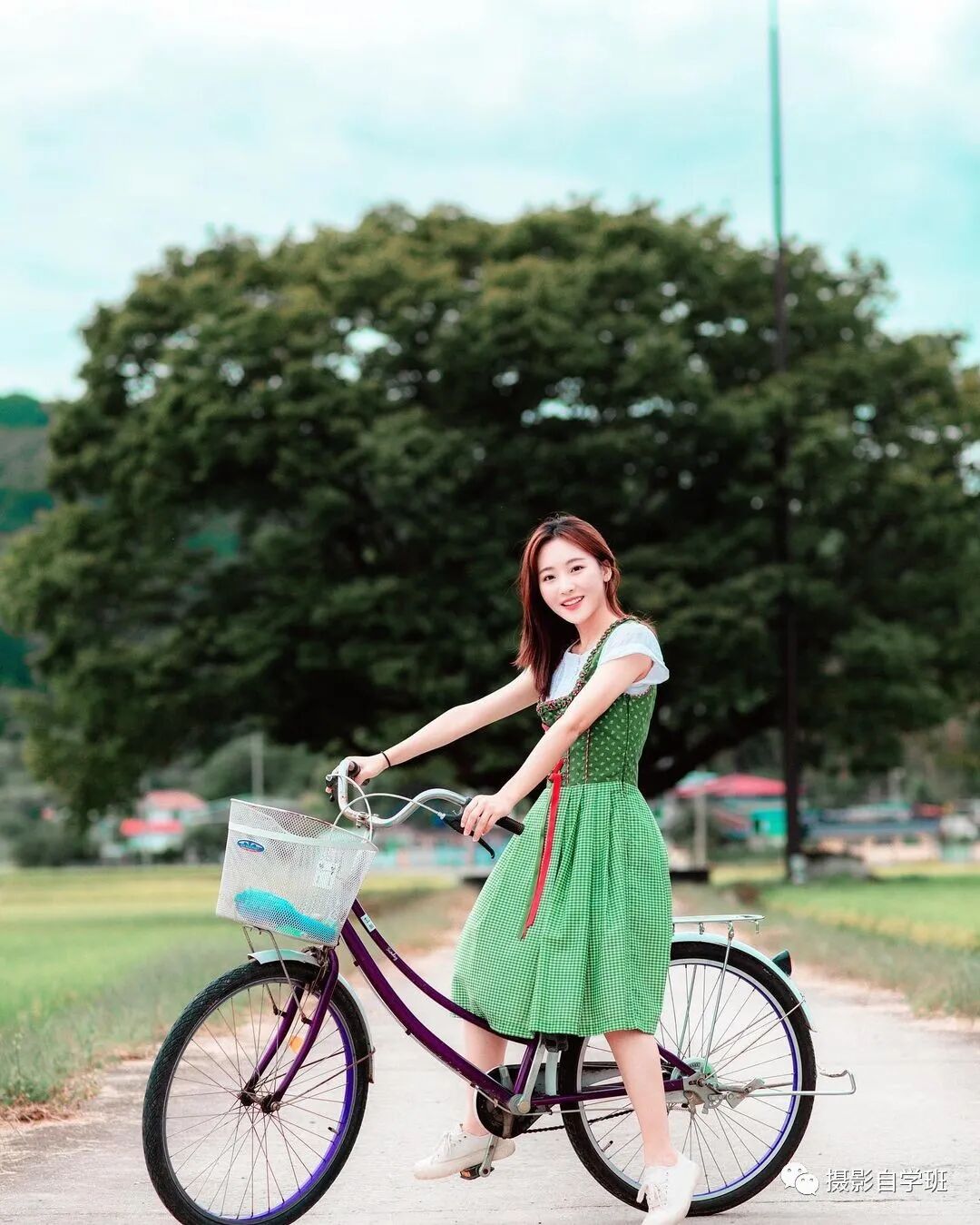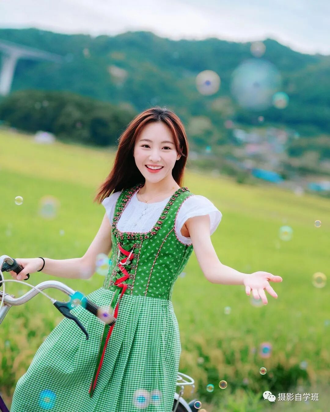 准备道具,比如泡泡枪或者自行车,这些道具可以让照片更加有趣和生动。这个技巧,可以帮助被拍的人摆出更多姿势,因为有道具互动,姿势就更加自然协调。图9背景明显的水平线,但水平线被拍歪了,很影响整体观感,让人感觉照片不稳定。机位再高一点,不露出山上的天空,背景更加纯粹,整张照片可以更好看。