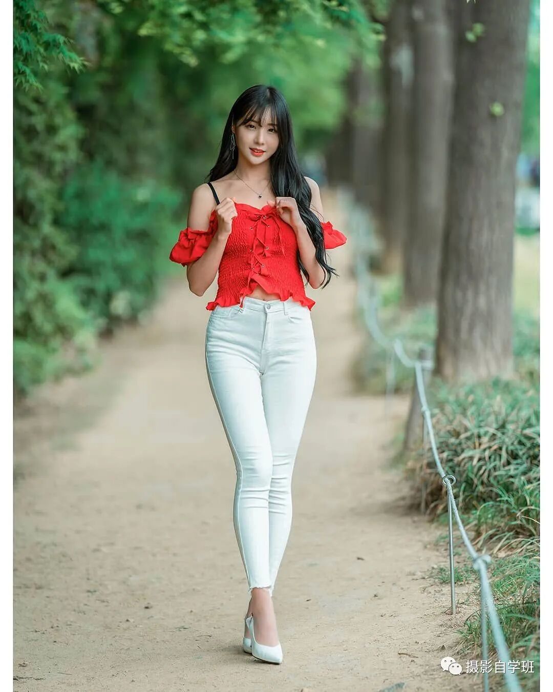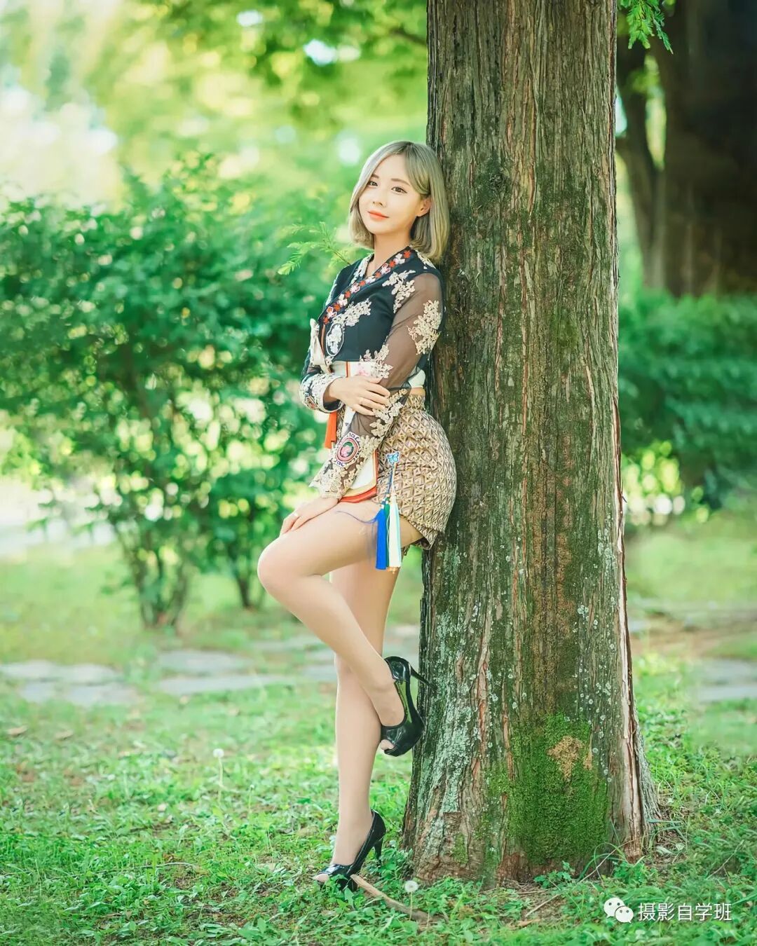 当你在大树旁拍照时,可以站在两排树之间像图2这样 ,因为树是笔直的,可以衬托显得人更苗条挺拔。还可以像图3这样,依靠在大树上,显得更加纤瘦。两条腿不要并排站立,而应该像图3这样,一高一低,一直一曲。除了显苗条以外,还会更加优美。