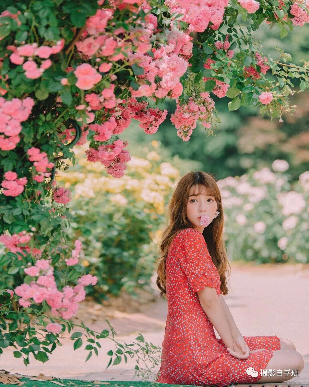如果花比较高的话,干脆让被拍摄的人,像图3这样坐在花下面,先让她别看镜头,拍摄的时候,摄影师叫她一声,她再回头面对镜头,这样随时与摄影师有互动,与镜头有互动的姿势,就会更加自然不做作。