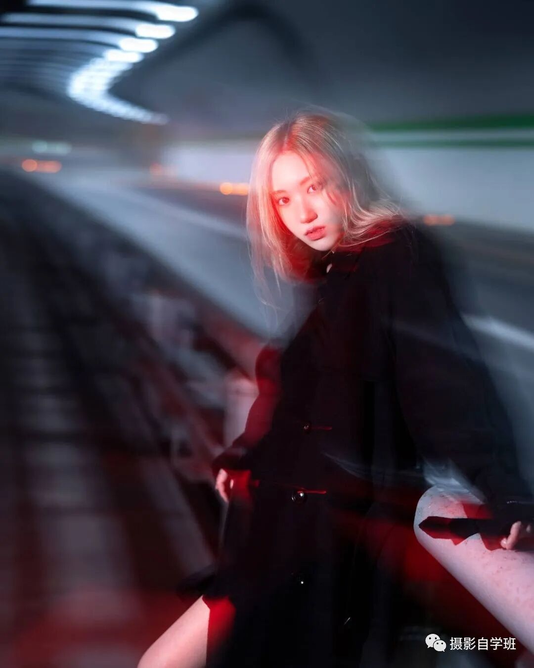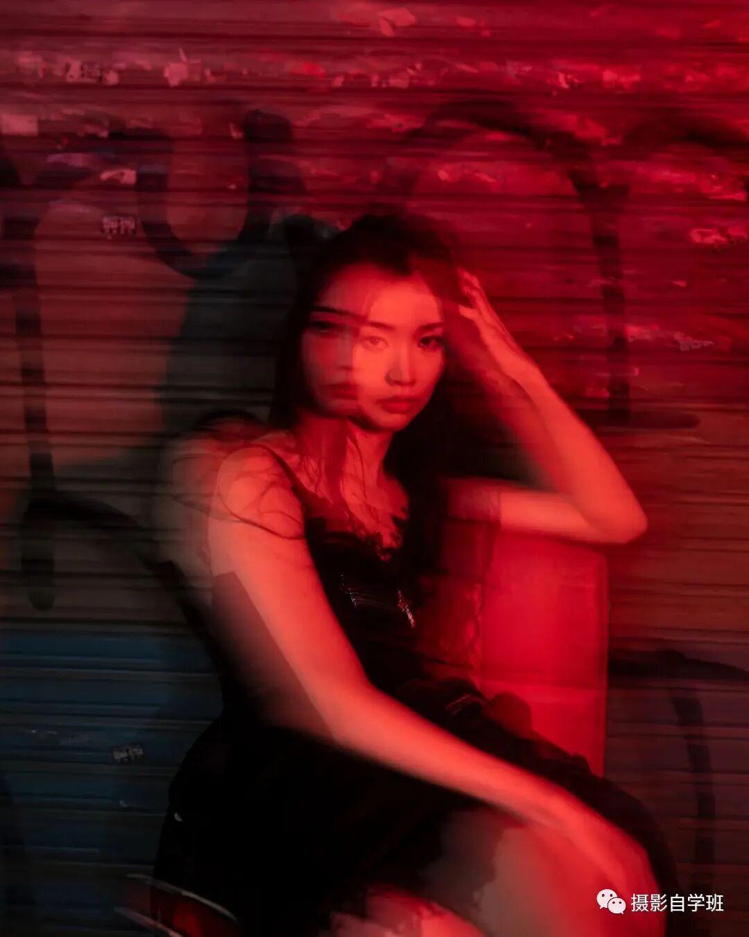 这里需要甩相机,拍摄之前调慢快门速度,同时把光圈的数值调大,也就是让光圈变得更小,减少进光量,拍摄的时候对焦在人物的眼睛,按下快门的同时,轻微抖动,相机就能够实现这种拖影的效果了。