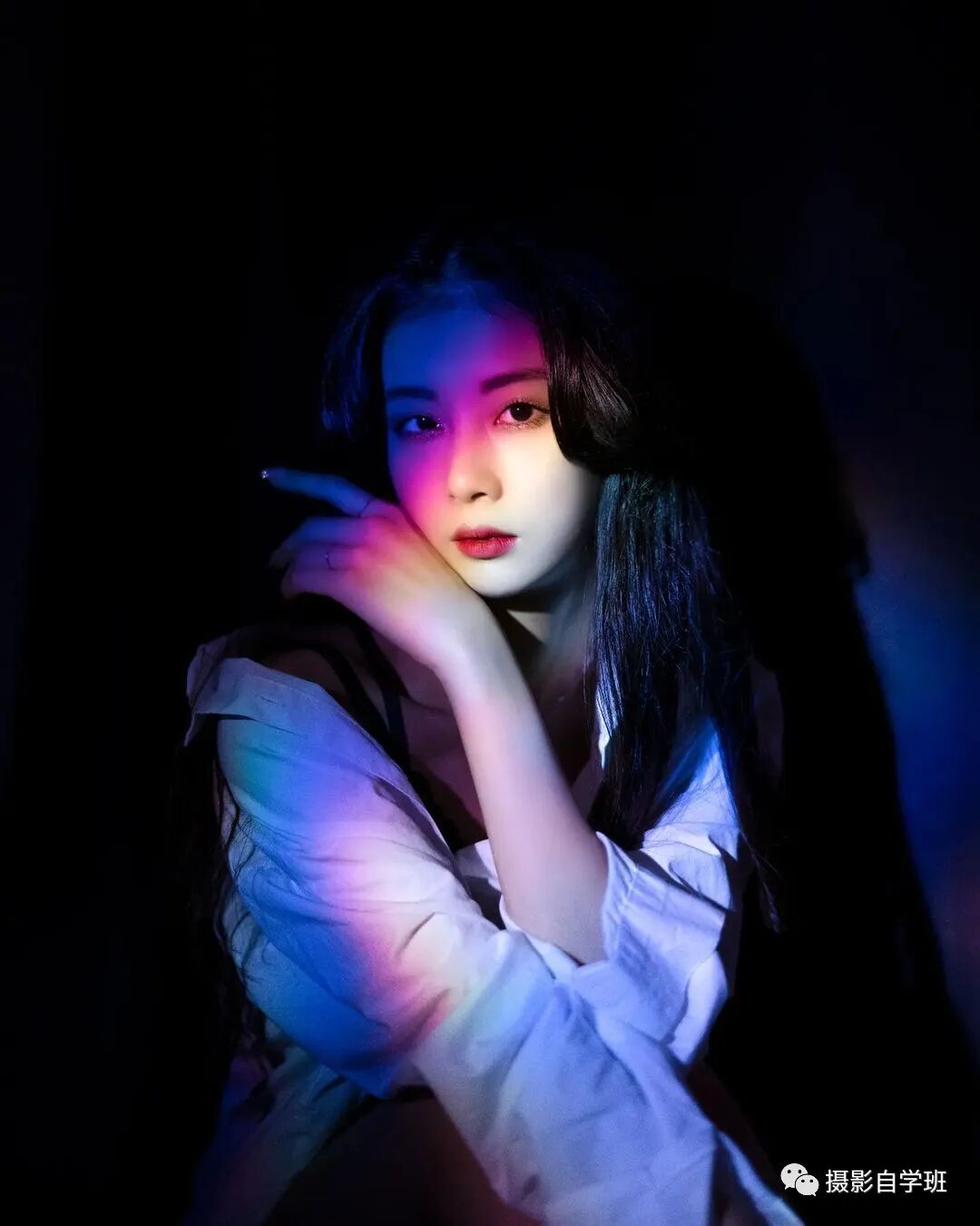 或者准备一个多彩的灯光,如果没有多彩的灯光,可以准备不同颜色的塑料袋,透过塑料袋之后,有颜色的光线,投到人的脸上、身上,就能拍出图9这样,更加绚烂的电影照片了。