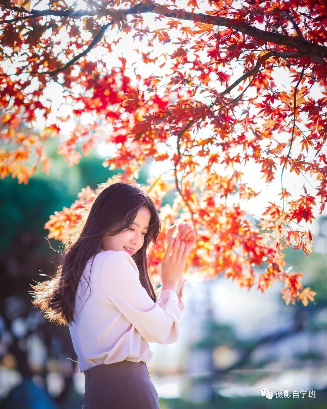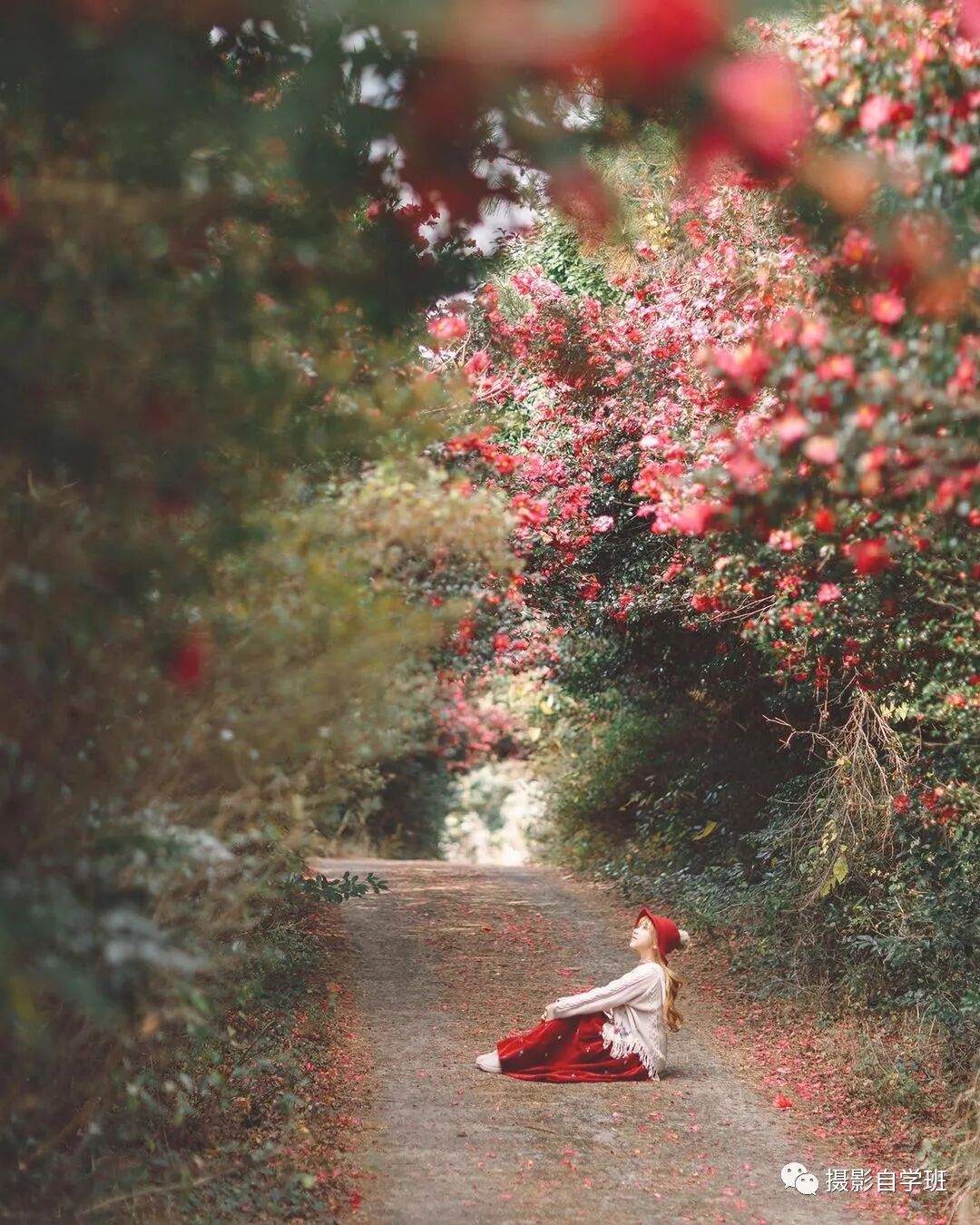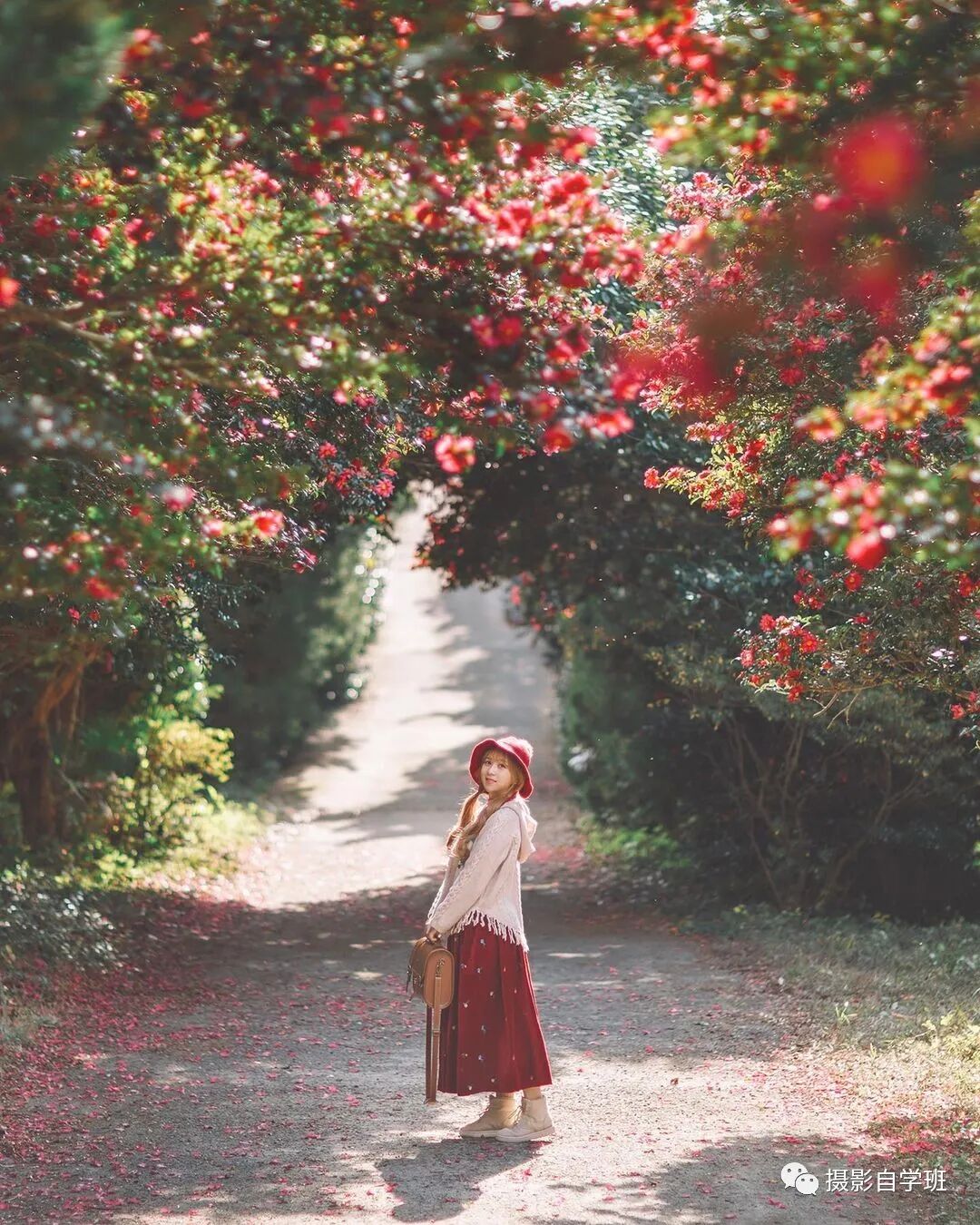 像图10图11中,背景的主要景物,吸引观者注意力的,就是红色的花,那让被拍摄的人,戴着红色的帽子,穿着红色的裙子,通过衣着的颜色,与背景花的颜色,形成关联,这就是呼应。