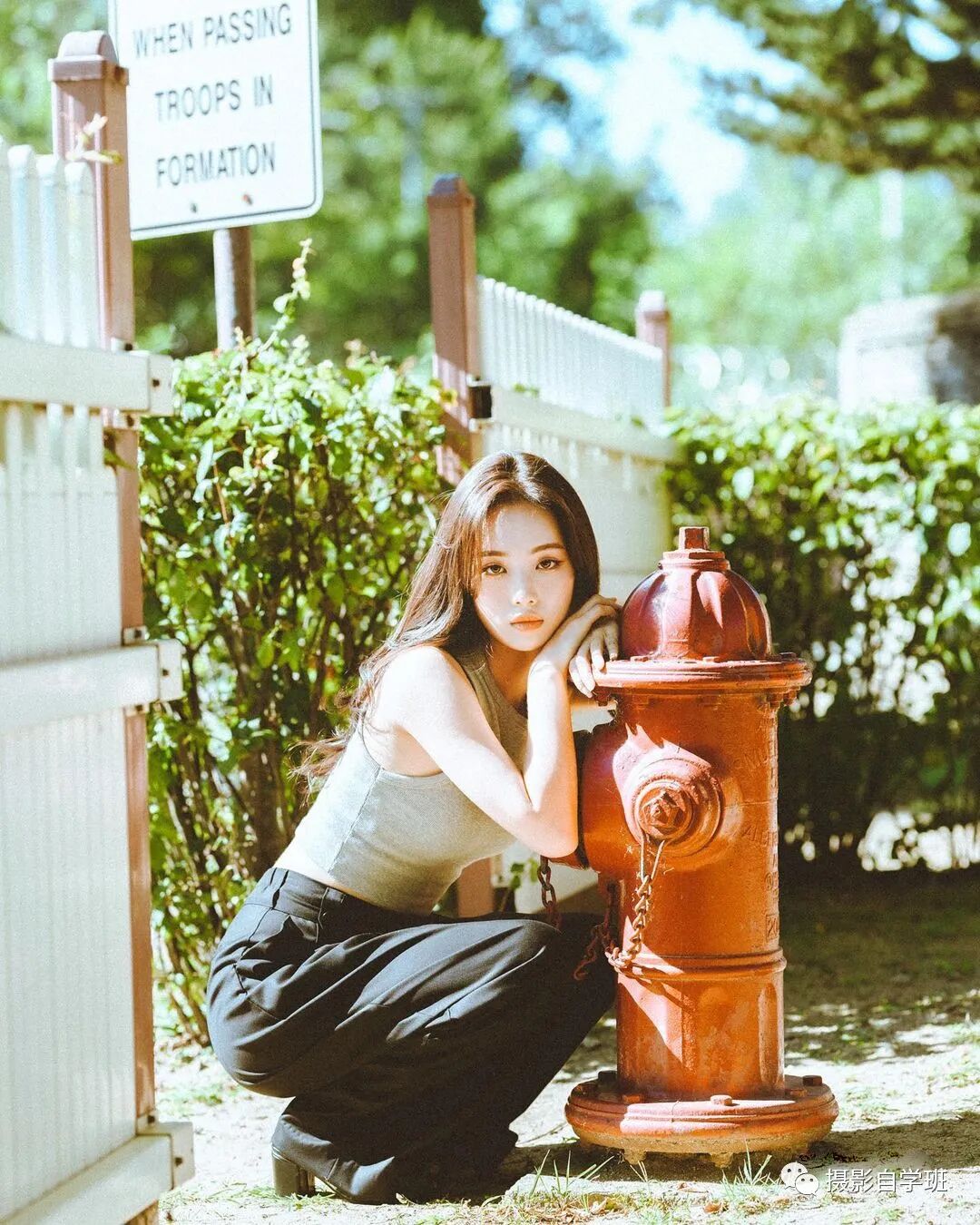 即使利用生活当中的防火栓,像图7或者像图8、图9这样,坐在草地上,通过自然光给出的色彩,都能拍出好看的照片了。光照给出的色彩,更强调整体的氛围。会让照片整体,都感觉比较暖,或者比较冷,这里被拍摄的人,与周围的环境,就要起到点缀的作用了。