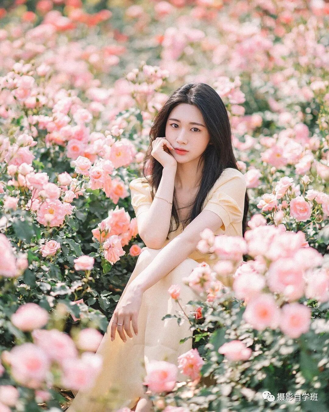或者让人像图5这样,坐在花丛中,用花遮挡住地面,这样就可以一只手搭在腿上,一只手托起下巴,不用摆出剪刀手了,这样的姿势,与整个环境更加搭配,看起来自然又协调。