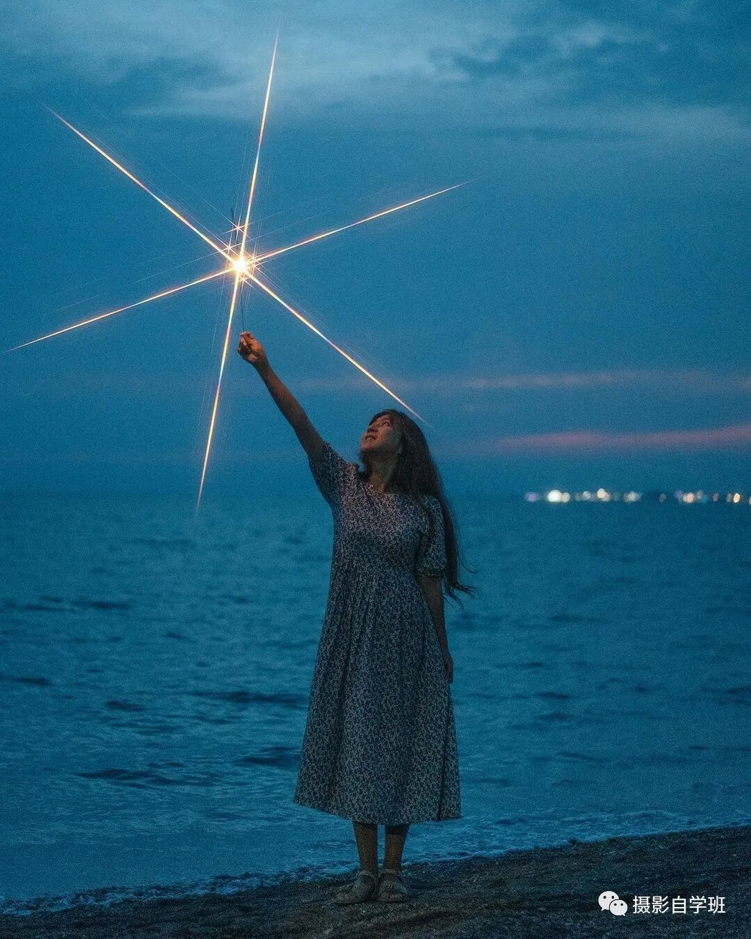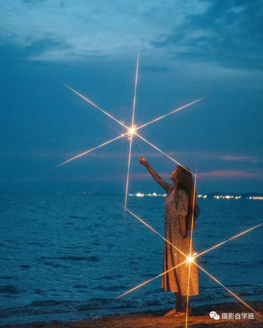 如果是像图9这样,在海边夜晚进行拍照,此时要等天没有完全黑下去时,再拍,天边远处还能看到淡淡的晚霞,自己要带上一些光源,比如图9这样的小烟花,拍摄的时候,就点燃它,小烟花会形成很好的点缀,如果漆黑一片,就不好看了。而图九与图10这样,有一些星星点点的光,照片看起来,就不会那么沉闷死板。