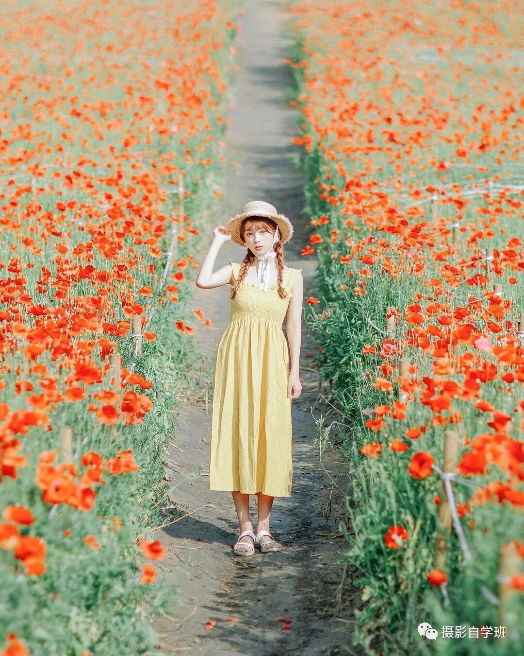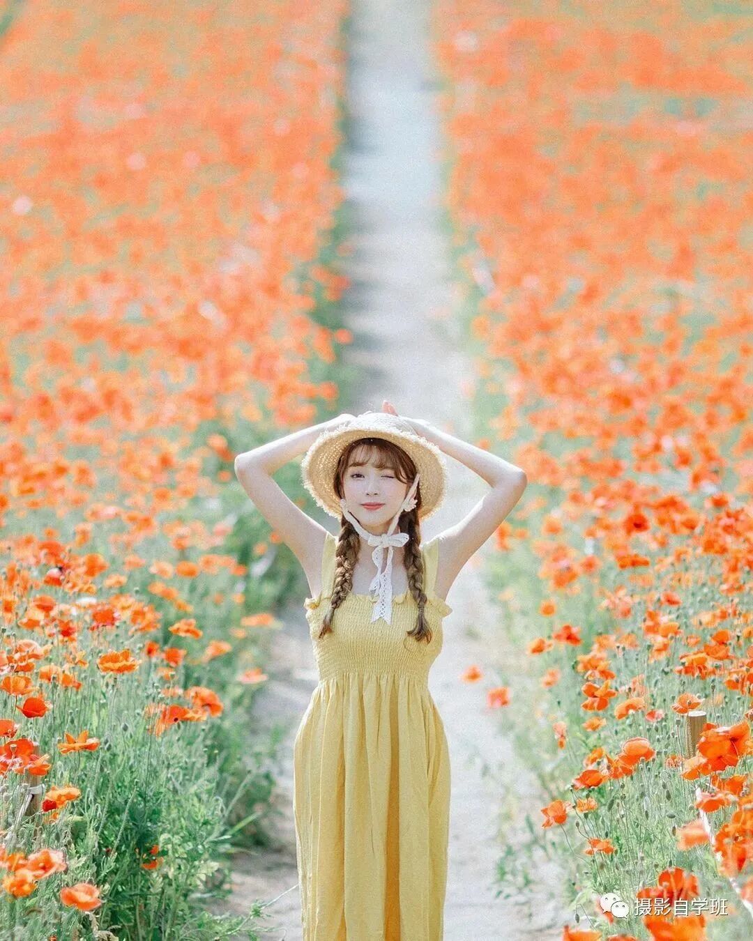 图7、图8这样的花丛中,有小鹿,那就让被拍摄的人,站在小路上,可以像图7这样,用手扶着帽子,也可以像图8这样,把双手背在头后,一只眼睛睁开,一只闭上,路在画面的中心,引导观者看向远方,照片的空间感、立体感会更好,人在中间的线条上,也更加突出,穿着的衣服颜色,与周围又形成明显差别,这些个技巧结合在一起,就能拍出好看的生活照片。