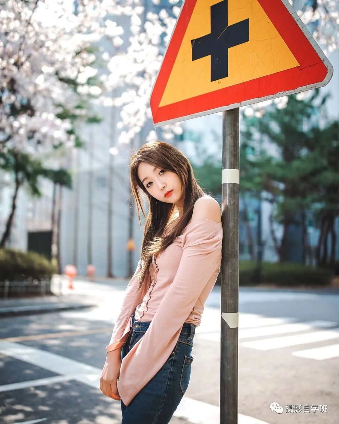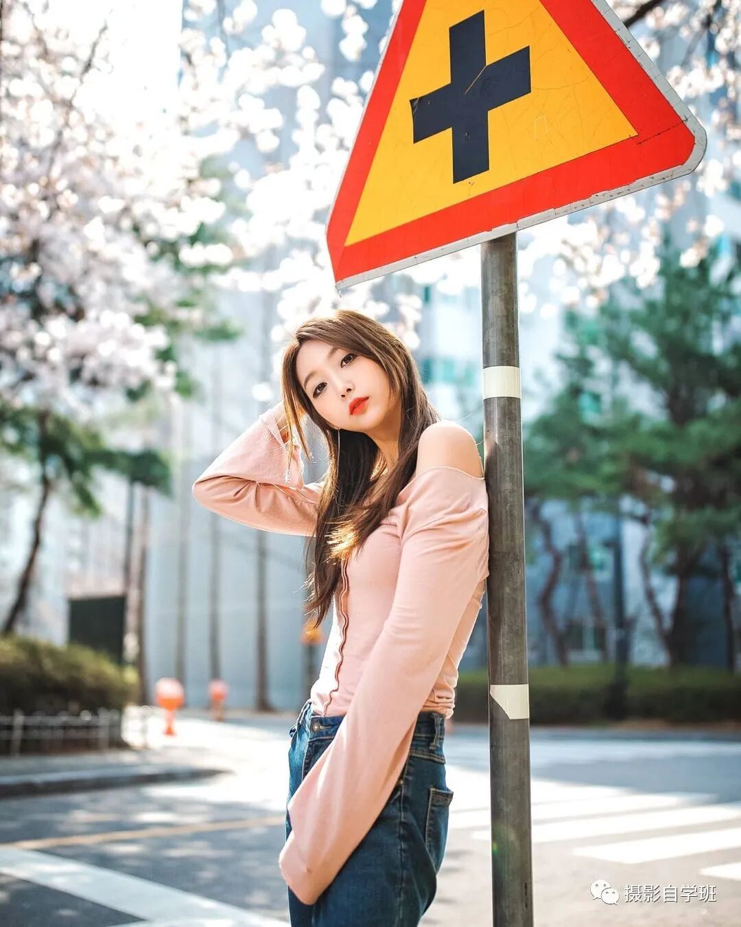 无论是使用手机摄影,还是相机摄影,人物没有姿势可摆的时候,都可以让他像图11、图12这样,利用现场的元素,摆出更多的姿势,在绝对安全且不影响交通的情况下,可以让他像图11图12这样,依靠在一些路标指示牌处,同时要注意调整拍摄方向,逆光拍摄,光从头顶来,照到人的头发,会让人的头发,更好看,也能让人的脸不暗。