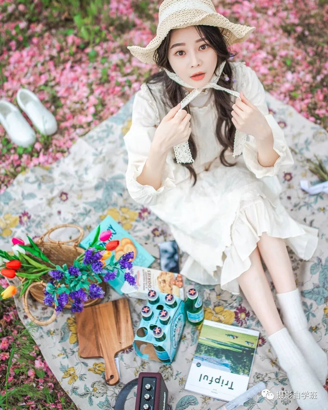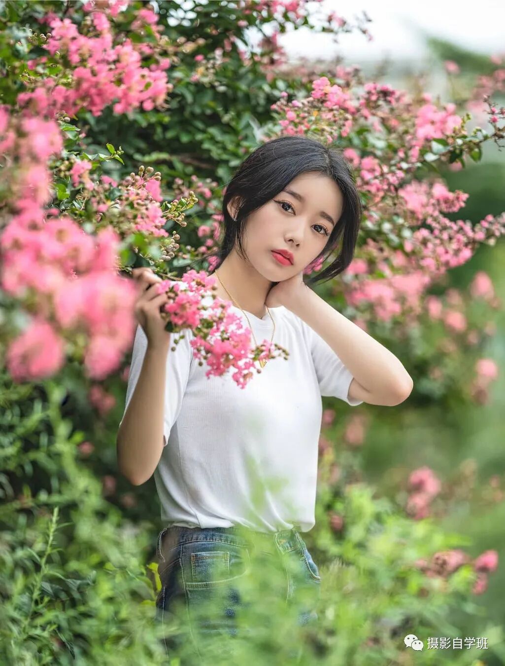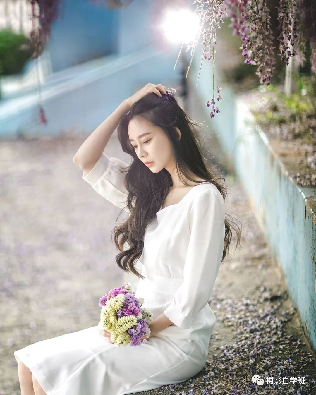 但是图2这样蹲着的姿势,并不是太优美,倒不如像图3、图4这样,拿着一束花站在那里,可以闭着眼睛,享受惬意的微风,也可以睁开眼睛,不看镜头,看向别处,避免面对镜头的尴尬,让人的面部表情,更加自然。