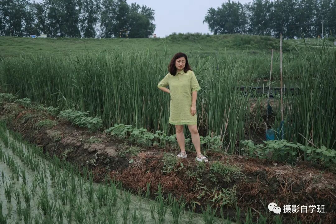 拍摄这种户外场景的时候,挑选背景很重要。老孙穿了一件绿色的裙子,在绿色的场景中拍摄,不难看出是想让场景与人物相融合,不跳跃。所以我们先来看一下,下面这张图的背景选择,问题出在哪里。