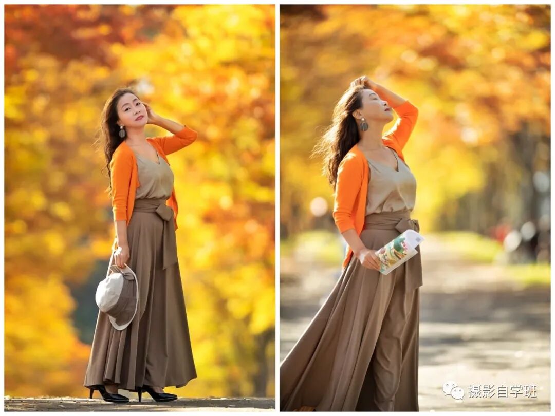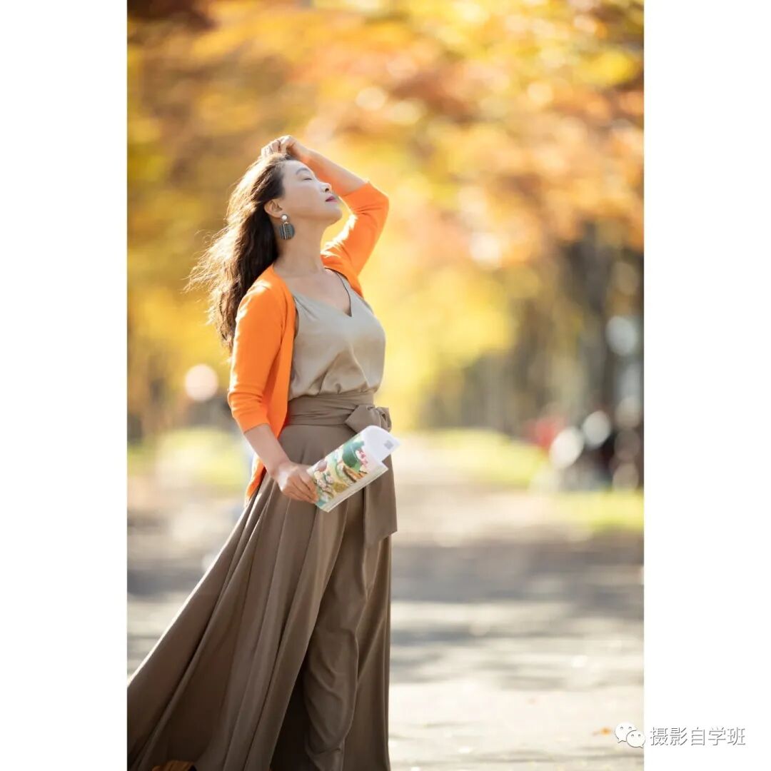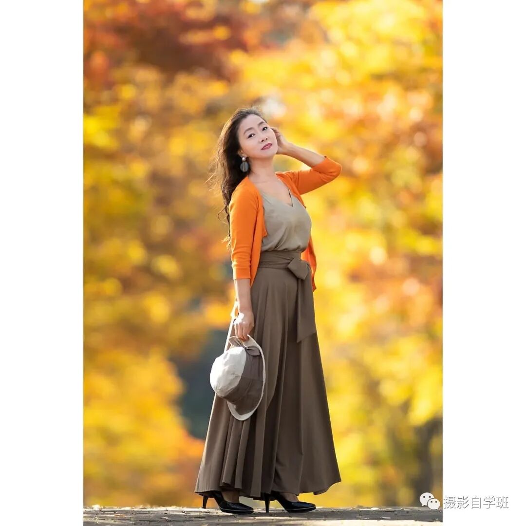 不管是在春天还是在秋天,在拍摄的时候,如果背景杂乱,摄影师要蹲下来拍摄,这样就能够通过改变角度,让背景看起来更加纯粹,如果背景上有漂亮的树叶,就可以拍的得如甜羹一样美妙了。人物的姿势,可以像上图与下图这样,看起来优雅又有气质。