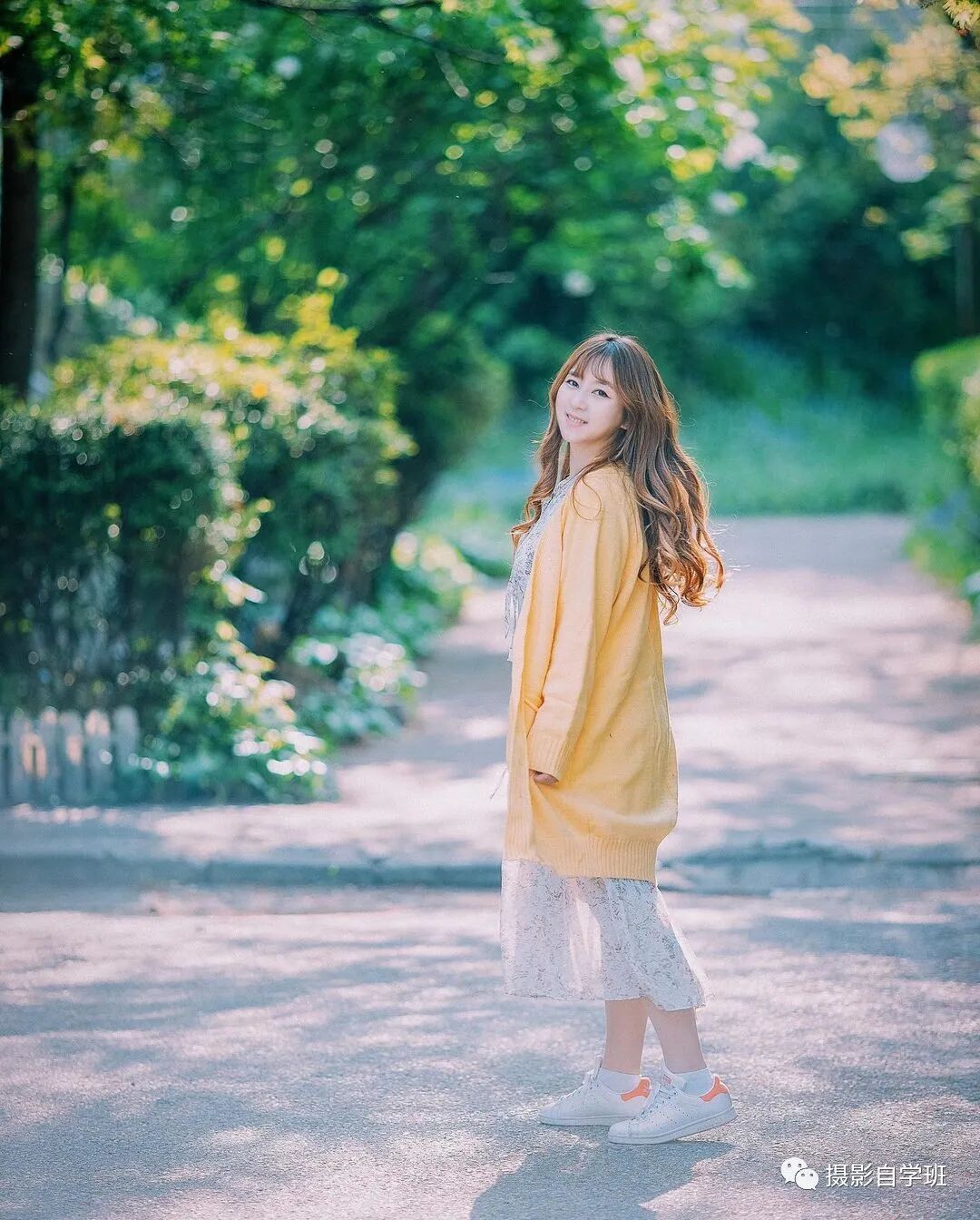 可以像上面这张照片,与下面这张照片一样,让被拍摄的人,走到林间或者树下的光影里,尤其是在这种光影斑驳的路上。斑驳的光影,可以让你的照片细节更加丰满,好似梦境一般。