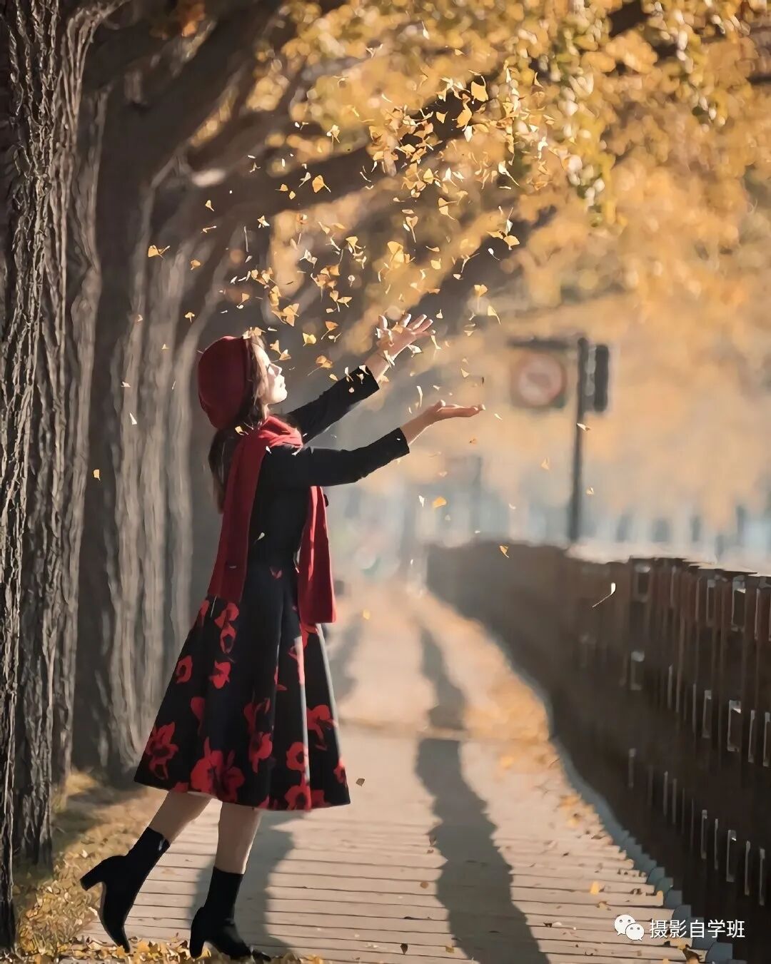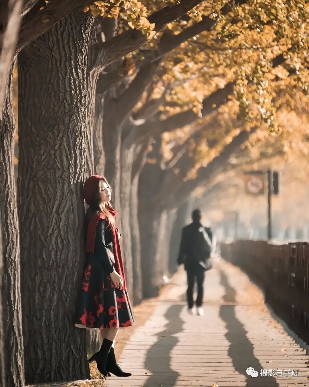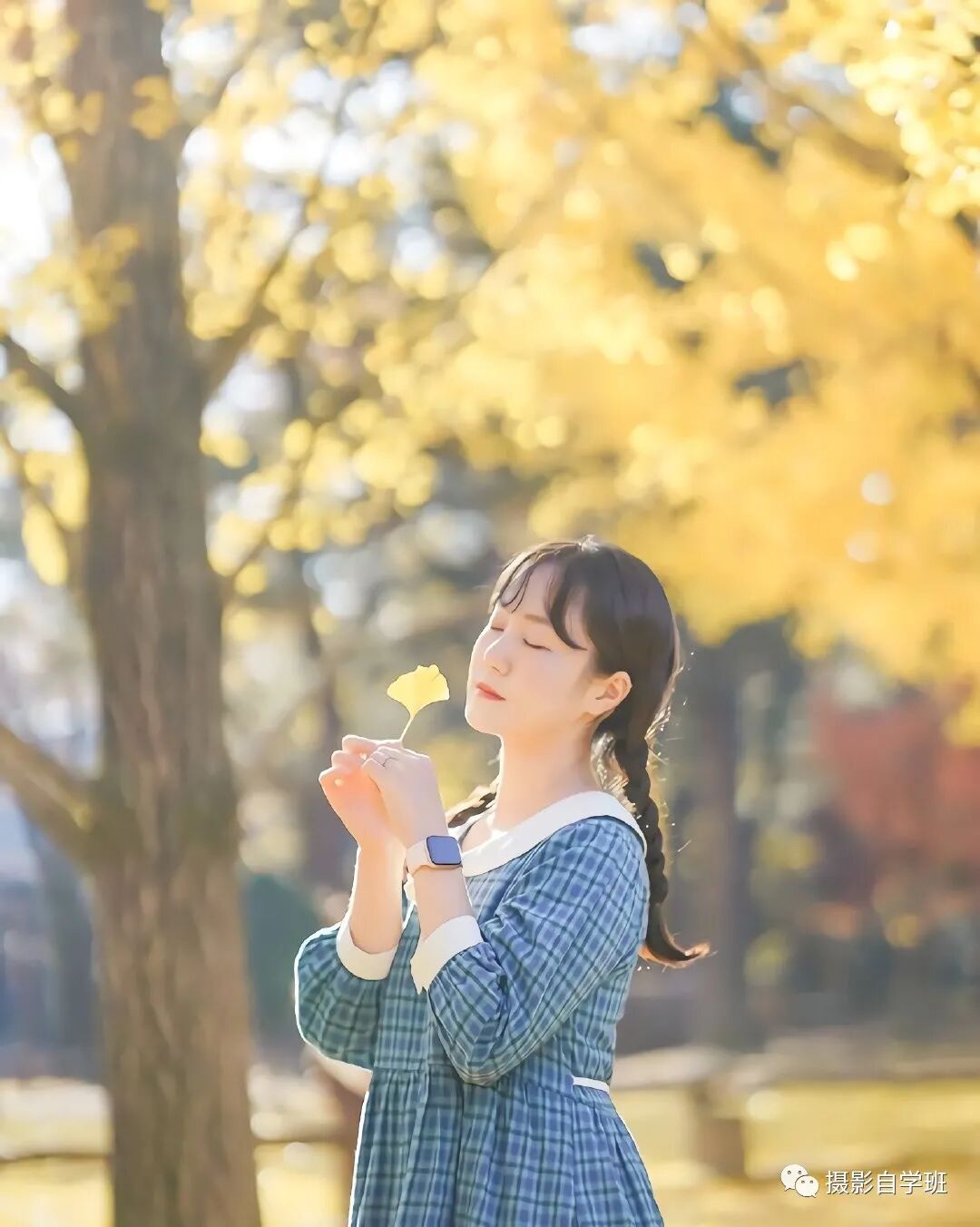 拍人的照片,照片想美,除了人美以外,作为陪衬的环境也要美,这样照片才优雅又漂亮。像上图背景中,右侧的黄叶很好看,但左侧的树干,又粗又壮又灰,就属于不美的景物,拍摄时应该调整角度,把这个树干排除在外。像下图这样,画面中没有明显的不美的景物,整张照片也会好看很多。