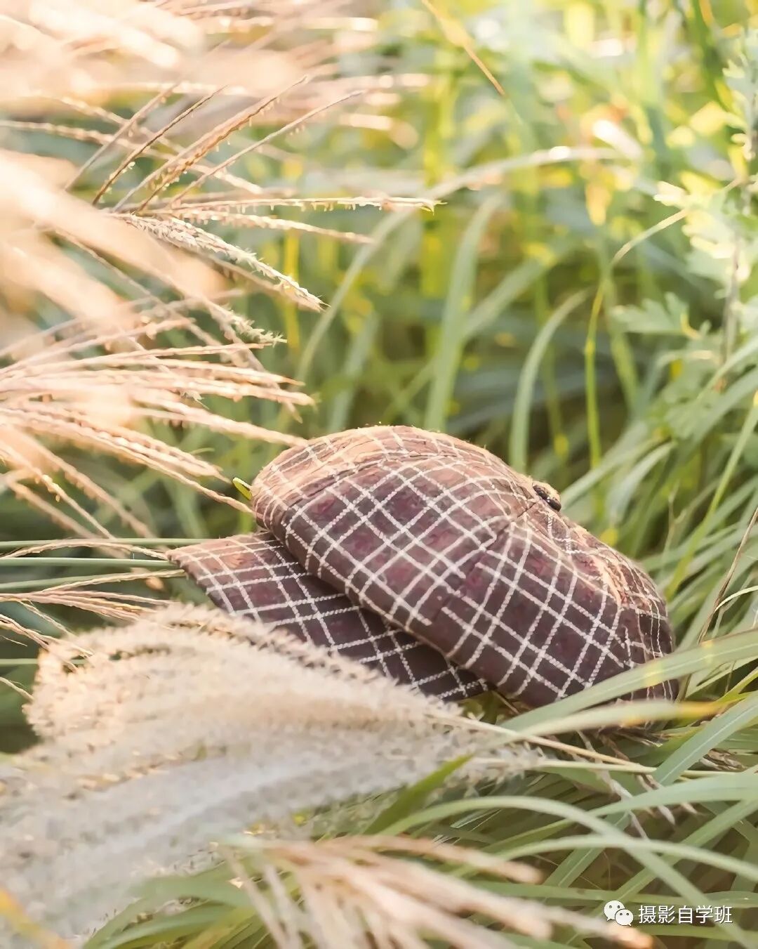 如果你拍摄的人像照片是成套的,不只是一张整体也要美观,同时也要体现一些细节,像上图一样让人的手扶着草逆光,拍摄人的手这种小细节照片优雅又漂亮。或者干脆像下周这样,只拍一些现场的配饰,如把帽子放在草丛中,这样被拍摄的人没有面对镜头,所以根本就不会紧张。而这样的照片又更显文艺优雅。