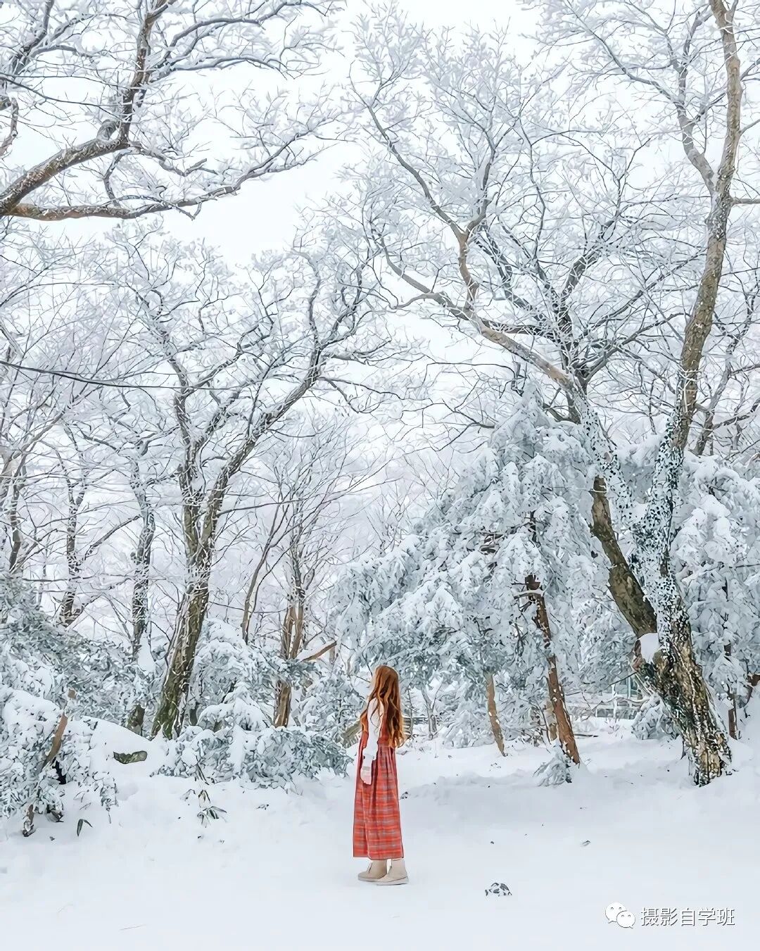如果是冬天雪后拍摄人像照片,重点是人一定要穿一些鲜艳颜色的衣服,这样在整张照片当中人才会更被突出出来。因为整个背景都是白色的,所以整张照片看起来必然会美美的,可以像上图那样,人不看镜头也可以像下图这样突然回头看镜头,这样人就不会因为面对镜头而紧张了。