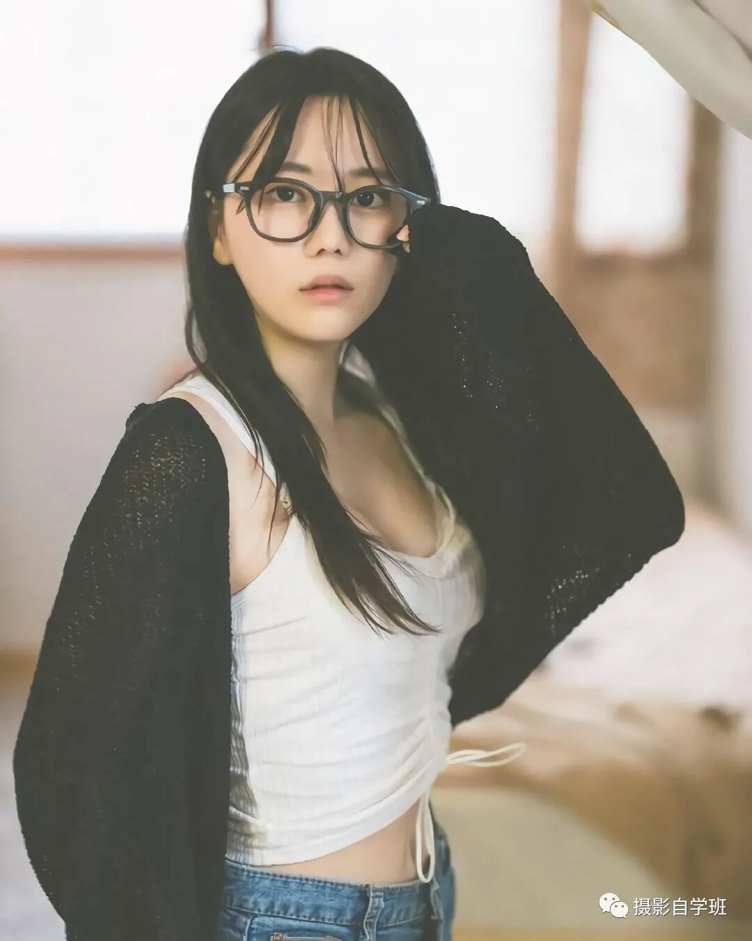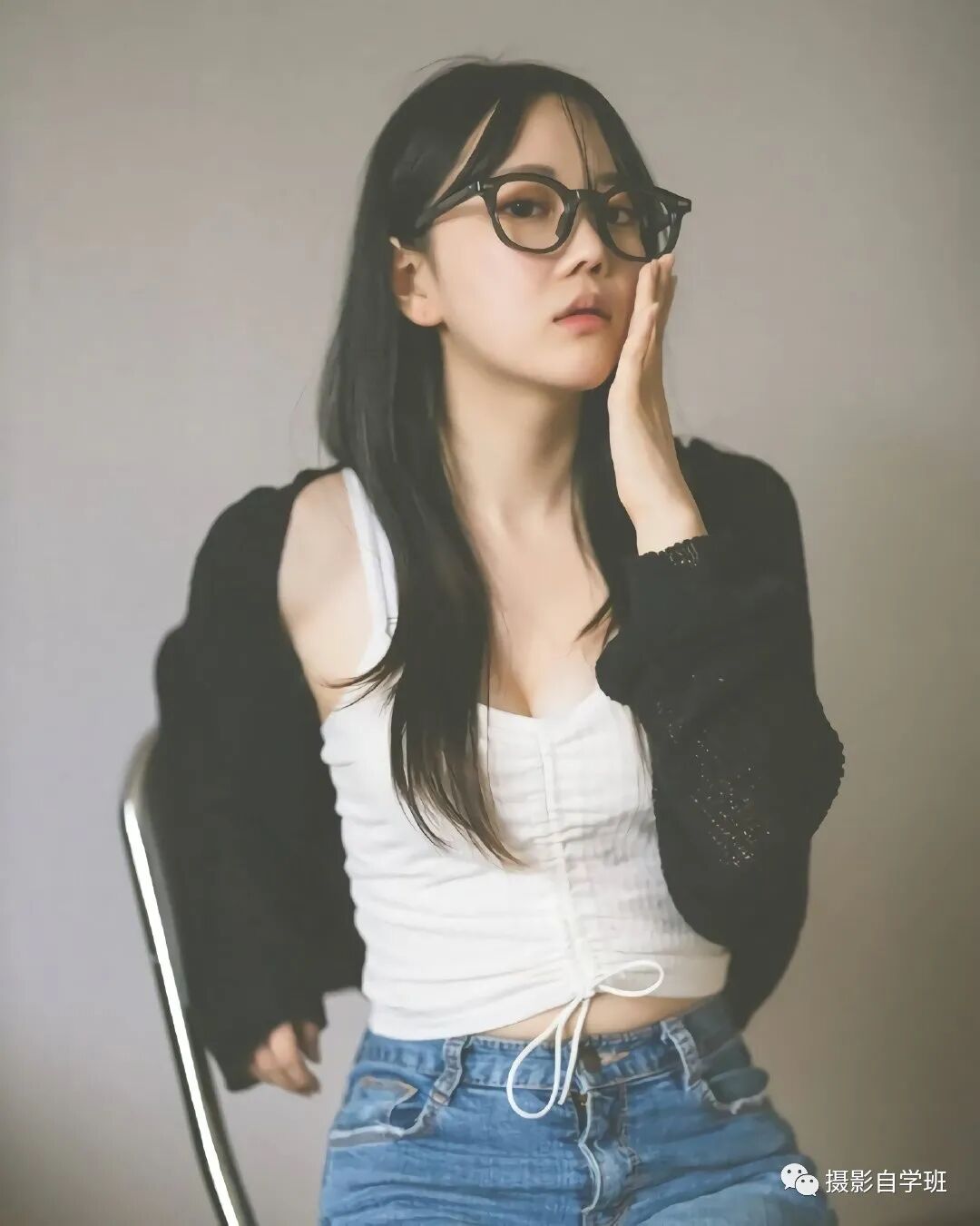 纯欲这个词最近很流行,那怎么拍出纯欲感,优雅又好看的照片呢?可以像上图这样把头发弄乱,带一个只有框没有镜片的眼镜作为装饰,一只手扶住下巴作为动作。或者像下手这样戴同样的眼镜辅助镜框,看着镜头,头发乱乱的,就有纯欲的感觉了。因为有镜框配合摆动作,被拍摄者的精力就容易被分散,面对镜头时也不至于紧张。