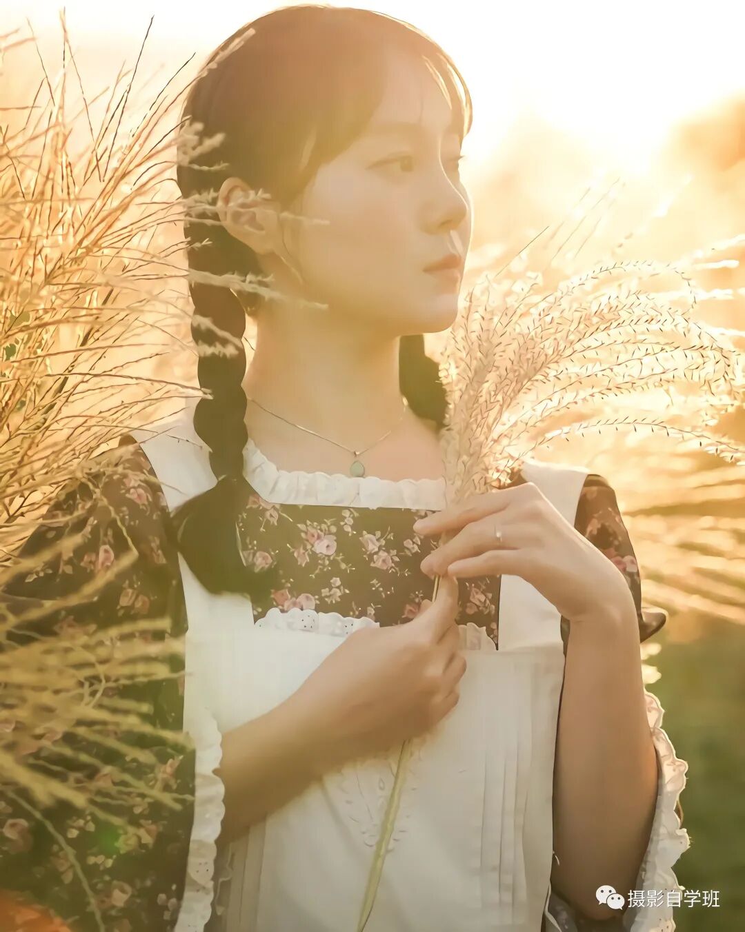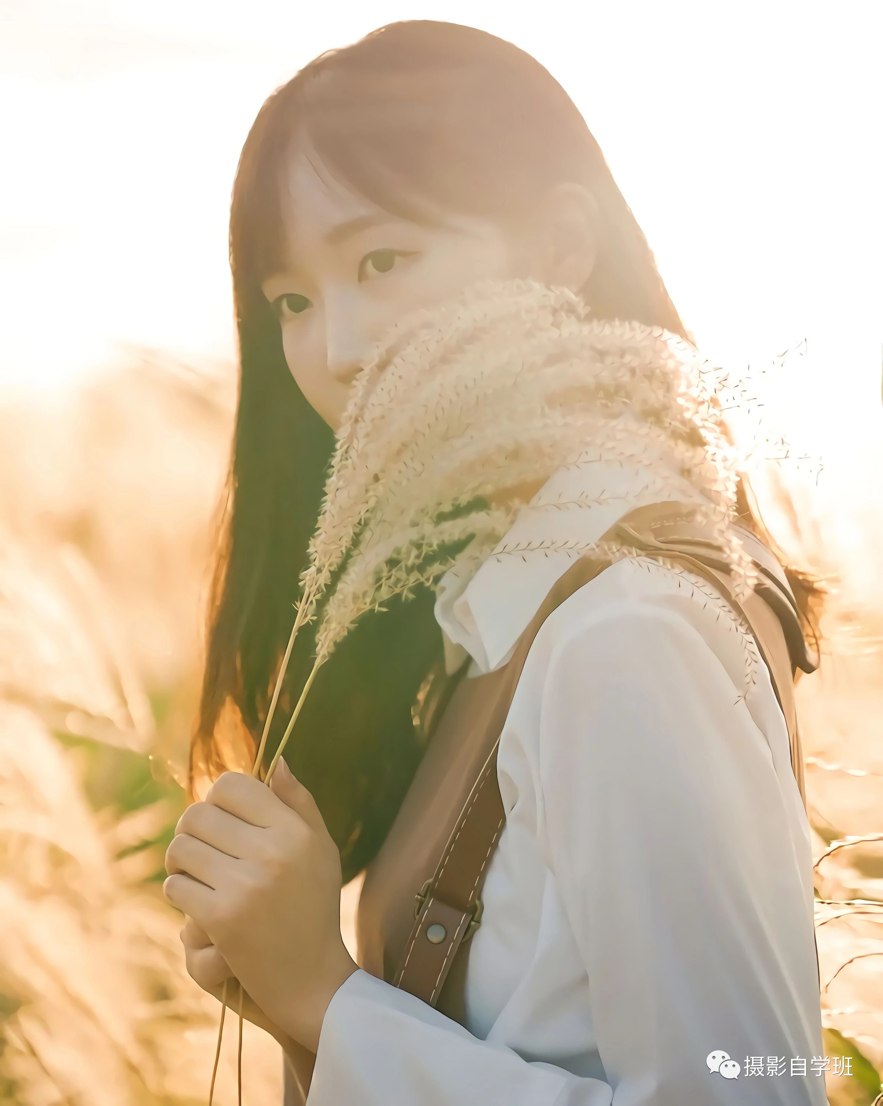 我们在一些荒野地里拍摄时,会遇到各种美好的植物,比如上图和下图这样的苇花,拍摄的重点是,要逆光拍,这样照片的色彩更好。同时要给人的面部补光,人的脸才不会暗。被拍的人就可以利用现场的苇花,摆出不同的姿势,可以像上图这样,遮挡面部,也可以像下图这样,不遮挡脸,但遮挡些光线。因为有现场植物道具的配合,照片就更显得大方得体,优雅美好了。
