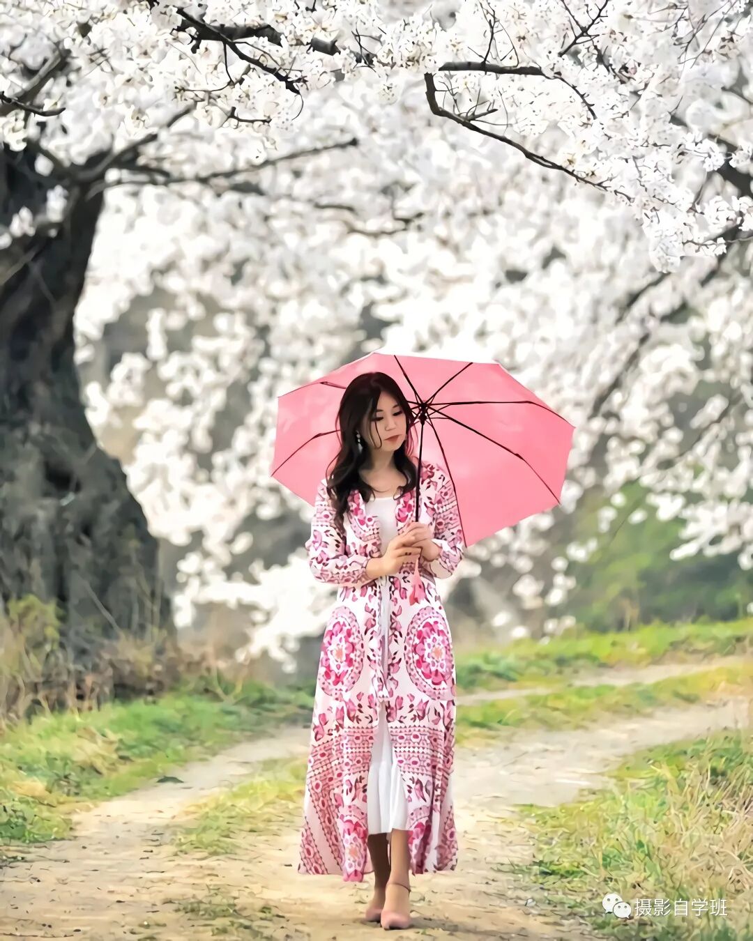 照片想要优雅大方,还可以在准备一把伞,伞可以是像上图这种白色的,或者像下图种粉色的。这种色彩更显得温柔,不要用黑色的,或者其他深色的伞,黑色的伞会显得庄严肃穆。姿势上,可以像上图这样,一手举伞,一手眺望,人在画面左侧大约三分之一处。还可以像下图这样,举伞搭在肩上,人看向地面。眼神温柔,照片也温柔。