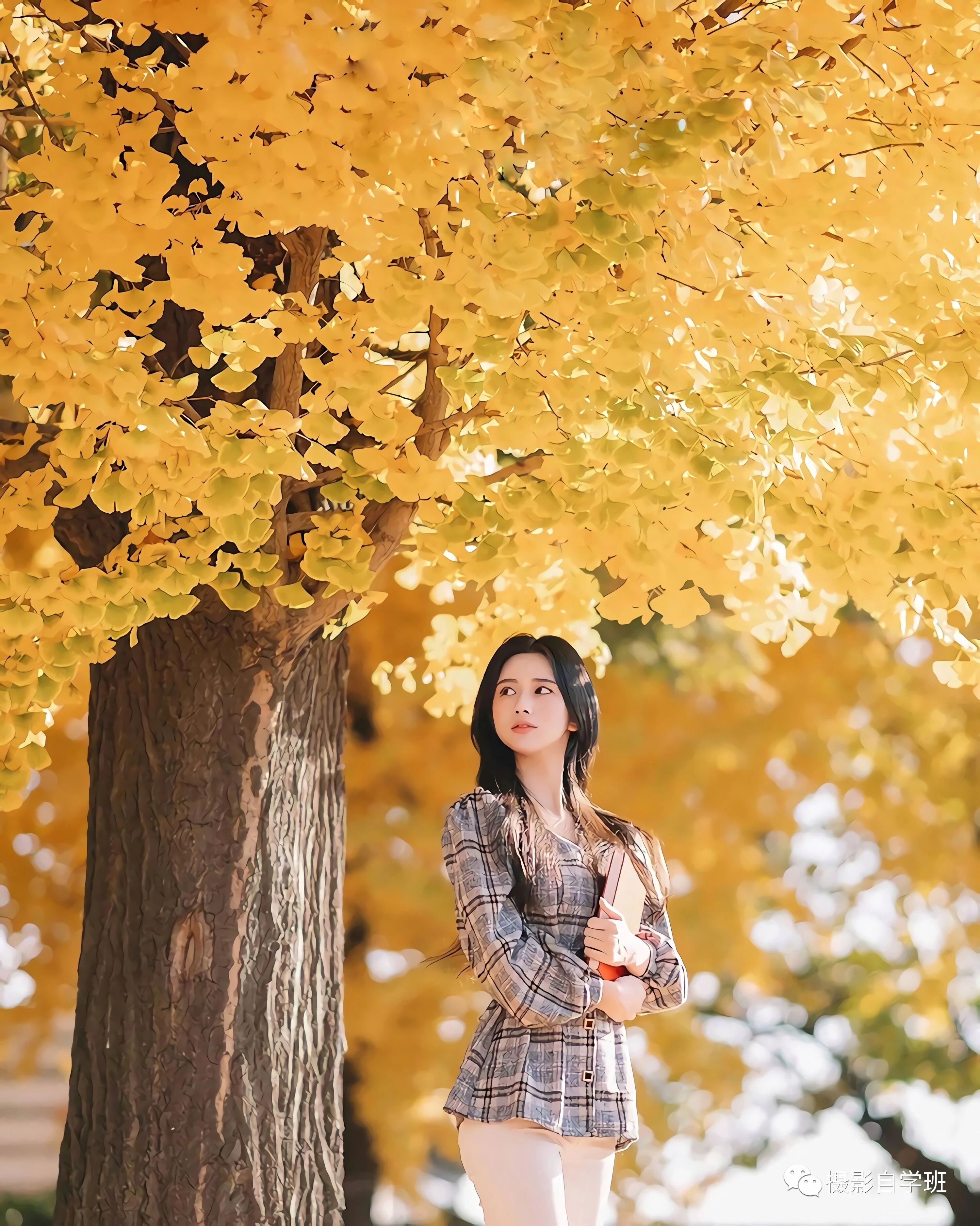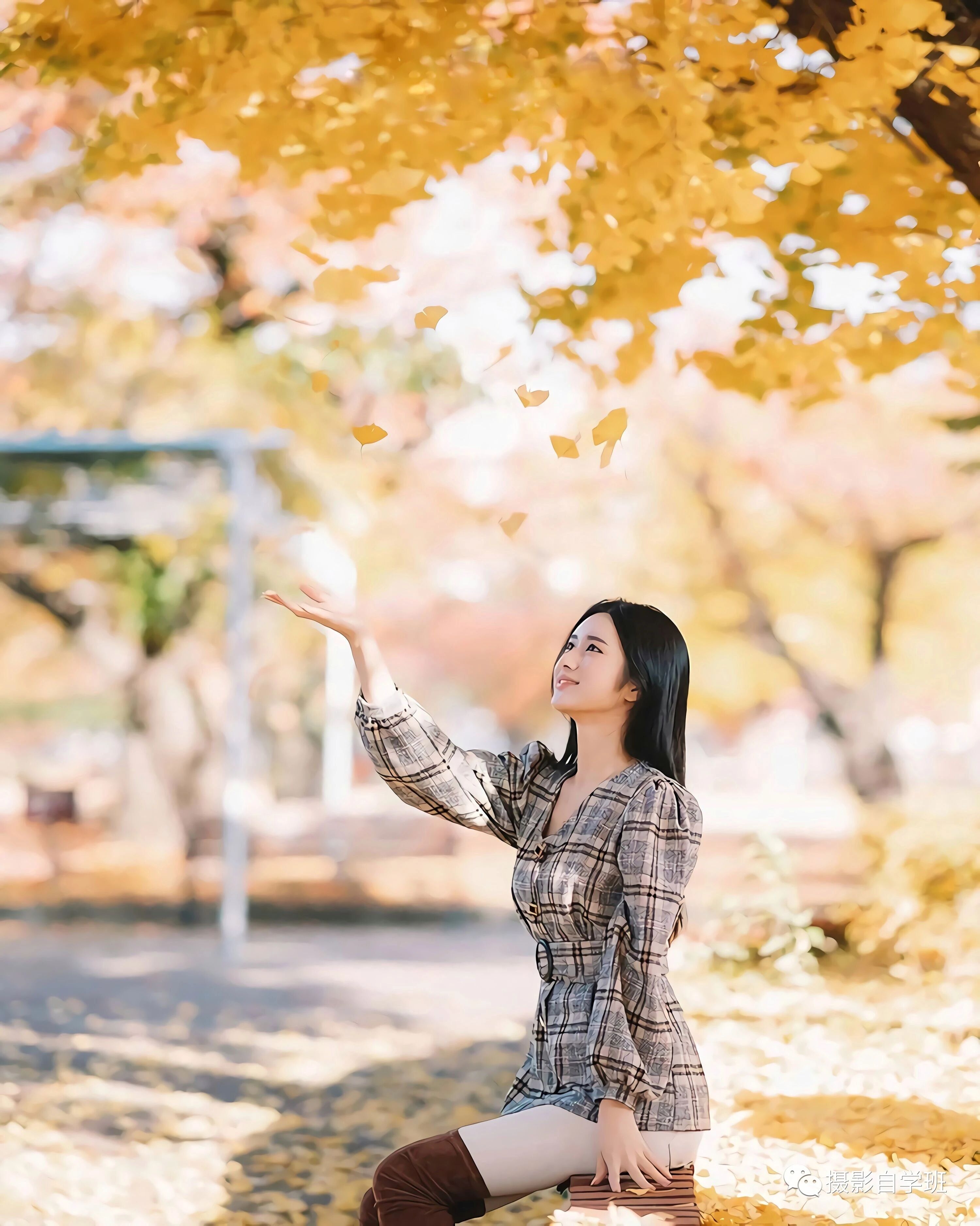 找一棵好看的树,人在树下,摄影师要引导被拍的人,有互动,比如像上图这样,让她看向别处,或者像下图这样,坐在树下的椅子上,和落叶互动。有互动,才可以,才自然优雅,整个画面颜色温柔,照片就温柔了。