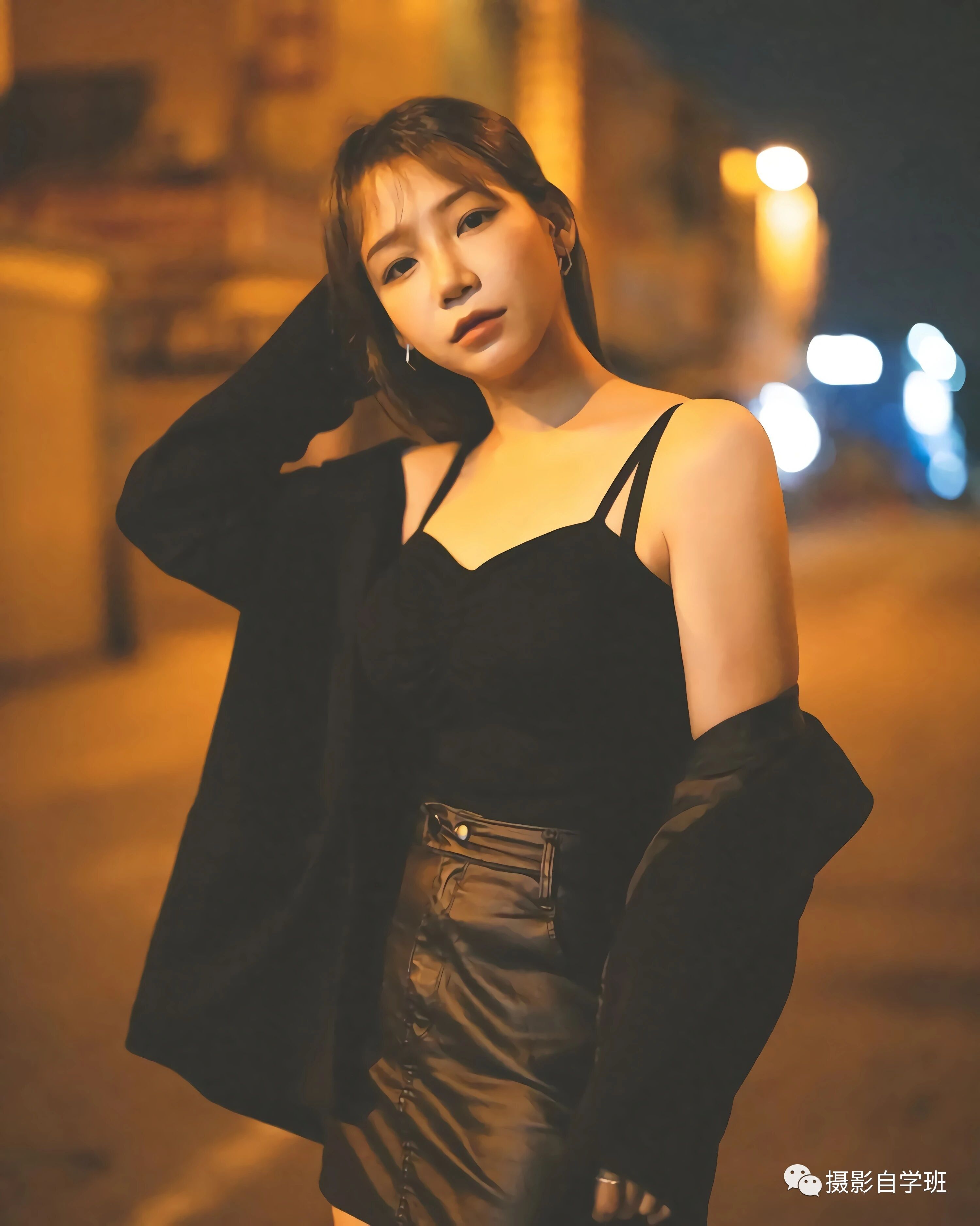 还可以拍一些洒脱的照片,姿势不用特意摆,拍摄之前,摄影师把相机设置好连拍,如果是夜里,把感光度调高,把光圈调大,把快门调快。调快快门,是为了抓拍,调大光圈,调高感光度,是为了增加曝光,以免画面过暗。可以引导被拍的人,像上图这样,摸自己的头发,或者引导她,像下图这样,仰头看天。这样的姿势,都很大方。