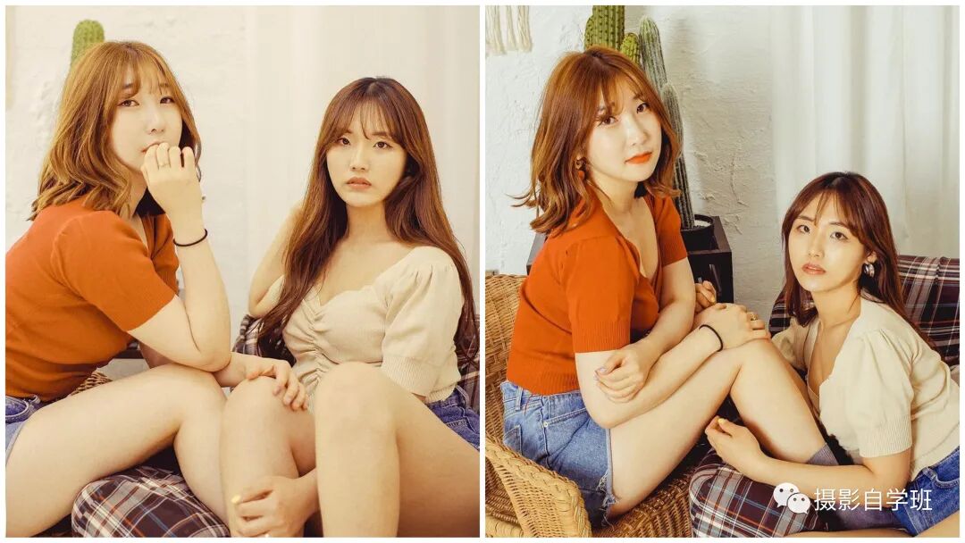 在室外摄影,还可以找一个有光影的地方,一个人蹲着,一个人站着,像上图左侧,这样如果没有光影的配合,也可以像上图右侧这样,两个人都坐在墙上,向下弯腰看向镜头。